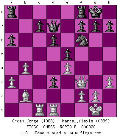 Last move : 1-0 2009 October 30 9:23:42 [Event "FICGS__CHESS__RAPID_E__000020"] [Site "FICGS"] [Date "2009.10.15"] [Round "1"] [White "Orden,Jorge"] [Black "Marcel,Alexis"] [Result "1-0"] [WhiteElo "1088"] [BlackElo "0999"] 1.e4 e5 2.Nf3 Nf6 3.Nc3 Bb4 4.d3 d6 5.Bd2 Bg4 6.Be2 Nc6 7.h3 Bxf3 8.Bxf3 Nd4 9.O-O Nxf3+ 10.Qxf3 O-O 11.a3 Bxc3 12.Bxc3 a6 13.b4 b5 14.Bb2 Qd7 15.c4 bxc4 16.Rac1 cxd3 17.Rfd1 1-0 Petrov Three knights game Kingside Castling by player White (move 9) Kingside Castling by player Black (move 10) Player White won this chess game. Follow this game move after move (download)Fischer was a master of clarity and a king of artful positioning. His opponents would see where he was going but were powerless to stop him. (Bruce Pandolfini) Frage des Reporters: -Worin besteht das Ziel von Gambiteröffnungen? Antwort: -Auf Kosten der Partie einen Ruf als Angriffspieler zu erwerben.- (Siegbert Tarrasch) Hay jugadores fuertes y personas amables y yo soy un jugador fuerte. (Bobby Fischer) Vous savez, camarade Pachman, je n'éprouve pas de plaisir à être ministre, je jouerais plutôt aux échecs comme vous, ou alors ferais une révolution au Venezuela. (Che Guevara à Ludek Pachman, 'Checkmate in Prague', 1975) The message for business people contemplating their place in the cyberspace is simple and direct: get linked or get lost. (Vic Sussman and Kenan Pollack)