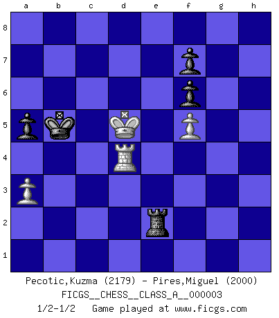 Last move : 1/2-1/2 2006 September 5 14:35:59 [Event "FICGS__CHESS__CLASS_A__000003"] [Site "FICGS"] [Date "2006.04.22"] [Round "1"] [White "Pecotic,Kuzma"] [Black "Pires,Miguel"] [Result "1/2-1/2"] [WhiteElo "2179"] [BlackElo "2000"] 1.e4 c5 2.Nf3 d6 3.d4 cxd4 4.Nxd4 Nf6 5.Nc3 a6 6.Be3 e6 7.f3 b5 8.g4 h6 9.Qd2 b4 10.Na4 Nbd7 11.O-O-O Ne5 12.Qxb4 Bd7 13.Nc3 Qc7 14.Qb3 Rb8 15.Qa3 Nc4 16.Bxc4 Qxc4 17.Qa5 d5 18.Bf4 Bb4 19.Qc7 Qxc7 20.Bxc7 Rc8 21.Be5 Bxc3 22.bxc3 dxe4 23.Bxf6 gxf6 24.fxe4 Rxc3 25.Rd3 Rxd3 26.cxd3 e5 27.Nf5 h5 28.Ng7+ Ke7 29.Nxh5 Bxg4 30.Ng3 Rh3 31.Kd2 Be6 32.a3 Kd6 33.Ke2 Kc5 34.Ke3 a5 35.Kd2 Kb5 36.Kc3 Ka4 37.Nf5 Bxf5 38.exf5 e4 39.Rd1 Kb5 40.Kd4 exd3 41.Rxd3 Rxh2 42.Kd5 Re2 43.Rd4 1/2-1/2 Sicilian : Najdorf, Byrne (English) attack Queenside Castling by player White (move 11) 10 pieces endgame at move 41 : White KRPPP , Black KRPPP WHITE : King + 1 Rook 3 Pawns BLACK : King + 1 Rook 3 Pawns 9 pieces endgame at move 41 : White KRPP , Black KRPPP WHITE : King + 1 Rook 2 Pawns BLACK : King + 1 Rook 3 Pawns This chess game ended in a draw. Follow this game move after move (download)The game of Chess is not merely an idle amusement; several very valuable qualities of the mind are to be acquired and strengthened by it, so as to become habits ready on all occasions; for life is a kind of Chess. (Benjamin Franklin) Das ganze Leben mit einer Ehefrau ist wie ein Endspiel mit ungleichfarbigen Läufern. (Viktor Kortschnoi) El Ajedrez por encima de todo... ¡es una pelea!. (Emanuel Lasker) Il (Jacob Murray) ne joue pas pour le bon coup, mais pour le meilleur. (Eloi Relange) Only sick music makes money today. (Friedrich Nietzsche)