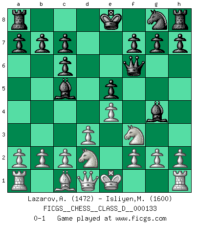 Last move : 0-1 2009 December 1 9:10:52 [Event "FICGS__CHESS__CLASS_D__000133"] [Site "FICGS"] [Date "2009.10.16"] [Round "1"] [White "Lazarov,Alexander"] [Black "Isliyen,Mehmet"] [Result "0-1"] [WhiteElo "1472"] [BlackElo "1600"] 1.e4 e5 2.Nf3 Nc6 3.Bb5 Qf6 4.Bxc6 dxc6 5.d3 Bg4 6.Nbd2 Bc5 0-1 This chess game has been lost on time (started : 2009.10.16 21:34:52) Ruy Lopez (Spanish Opening) Player Black won this chess game. Follow this game move after move (download)Whoever sees no other aim in the game than that of giving checkmate to one's opponent will never become a good Chess player. (Euwe) Die Leute spielen gegen mich seit 15 Jahren unter Ihren Möglichkeiten. (Robert James Fischer) Creo que una cierta cantidad de temperamento es esperada de los genios del Ajedrez. (Ron Gross) Vous m'avez demandé de vous exposer quel est le fondement de la prière. Je ne fais que préparer les pièces du jeu sur la table... Nous sera-t-il permis d'en adopter les règles et si nous les appliquons scrupuleusement nous ne tarderons pas à faire mat le Roi divin ! Il ne pourra échapper à nos mains. (Sainte Thérèse d'Avila, Chemin de perfection) Do not put your faith in what statistics say until you have carefully considered what they do not say. (William W. Watt)