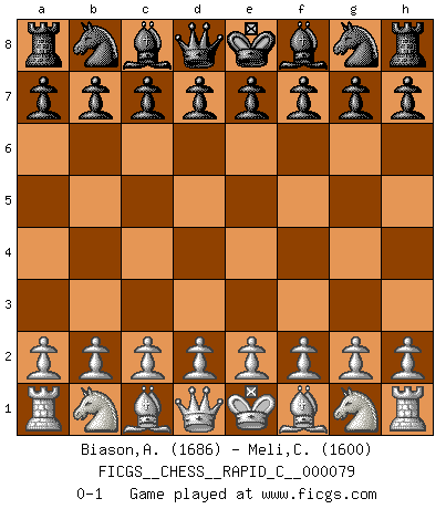 Last move : 0-1 2009 November 16 8:58:43 [Event "FICGS__CHESS__RAPID_C__000079"] [Site "FICGS"] [Date "2009.10.17"] [Round "1"] [White "Biason,Adriano"] [Black "Meli,Cosimo Leonardo"] [Result "0-1"] [WhiteElo "1686"] [BlackElo "1600"] 0-1 This chess game has been lost on time (started : 2009.10.17 3:51:14) Player Black won this chess game. Follow this game move after move (download)I play correspondence chess because it is both art and science while chess is art only. (A player at FICGS) Es hat in meinem Leben Zeiten gegeben, da ich sehr nahe daran war zu glauben, daß ich auch nicht eine einzige Schachpartie verlieren könnte. (José Raúl Capablanca) Aún deseo matar a Fischer. (Boris Spassky) Dans le domaine de la peinture, de la gravure et de la sculpture, dès la première décennie de notre siècle, les artistes abandonnent la représentation de la partie d'échecs pour se concentrer sur les pièces, sur les échiquiers et sur toutes les variations auxquelles les unes et les autres peuvent donner lieu. On passe en quelque sorte d'un thème social à un thème musical (au sens de la musica médiévale, c'est-à-dire d'une notion qui inclue le rythme, l'harmonie, la construction et la déconstruction, etc.). Graphiquement et picturalement, l'échiquier apparaît comme une structure ouverte, dynamique, d'une richesse infinie, autorisant toutes les combinatoires et débouchant sur des mouvements et des rythmes de nature exponentielle. (Michel Pastoureau) The mind is like a parachute, it only functions when its open. (Unknown)