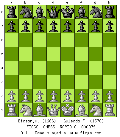 Last move : 0-1 2009 November 16 8:58:43 [Event "FICGS__CHESS__RAPID_C__000079"] [Site "FICGS"] [Date "2009.10.17"] [Round "1"] [White "Biason,Adriano"] [Black "Guisado,Francisco"] [Result "0-1"] [WhiteElo "1686"] [BlackElo "1570"] 0-1 This chess game has been lost on time (started : 2009.10.17 3:51:14) Player Black won this chess game. Follow this game move after move (download)There are tough players and nice guys, and I'm a tough player. (Bobby Fischer) Wer der Ansicht ist, daß alle Schachspieler verrückt sind, wird durch Studium des Lebens von Emil Josef Diemer nicht auf andere Gedanken kommen. (Hans Ree) El Ajedrez, como cualquier actividad creativa, solo puede existir a través del esfuerzo combinado de aquellos que tienen talento creativo y de aquellos que poseen la habilidad de organizar su trabajo creativo. (Mikhail Botvinnik) On entre au jeu d'Echecs comme on entre en Religion. Pour le joueur d'Echecs, la partie d'Echecs c'est l'office, la messe, le défilé du 1er Mai, le dépôt de gerbe au Monument aux Morts. C'est un drame sacré. (Michel Roos) The existence of forgetting has never been proved: We only know that some things don't come to mind when we want them. (Friedrich Nietzsche)
