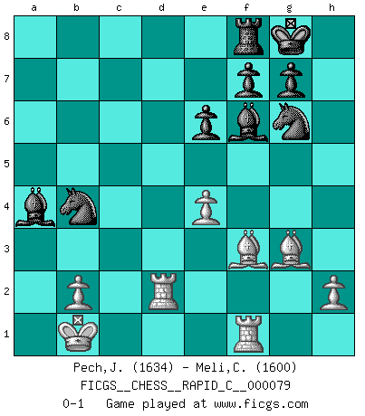 Last move : 0-1 2010 February 1 18:30:59 [Event "FICGS__CHESS__RAPID_C__000079"] [Site "FICGS"] [Date "2009.10.17"] [Round "1"] [White "Pech,Jaroslav"] [Black "Meli,Cosimo Leonardo"] [Result "0-1"] [WhiteElo "1634"] [BlackElo "1600"] 1.e4 c5 2.Nf3 d6 3.d4 cxd4 4.Nxd4 Nf6 5.Nc3 a6 6.Bg5 e6 7.f4 Qb6 8.Nb3 Nc6 9.Qf3 Be7 10.O-O-O Qc7 11.Be2 h6 12.Bh4 O-O 13.Rhf1 Rb8 14.g4 b5 15.a3 b4 16.axb4 Rxb4 17.g5 hxg5 18.fxg5 Ne5 19.Qe3 Nfd7 20.Bg3 a5 21.g6 Nxg6 22.Nb5 Qb8 23.Nxd6 Nde5 24.Nf5 Bf6 25.Nfd4 a4 26.Nc6 Rxb3 27.cxb3 Qc7 28.Qc5 Qxc6 29.Qxc6 Nxc6 30.bxa4 Bb7 31.Rd7 Ba8 32.Kb1 Nb4 33.Bf3 Bc6 34.Rd2 Bxa4 0-1 Sicilian : Najdorf, 7...Qb6 Queenside Castling by player White (move 10) Kingside Castling by player Black (move 12) Player Black won this chess game. Follow this game move after move (download)A player surprised is half beaten. (Proverb) Ich bin stolz ein Bulgare zu sein. (Veselin Topalov) Vive, pierde y aprende al observar a tu oponente como gana. (Amber Steenbock) Aucun coup ne doit être joué sans but. (Pedro Damiano) Sometimes it pays to stay in bed in Monday, rather than spending the rest of the week debugging Monday's code. (Dan Salomon)