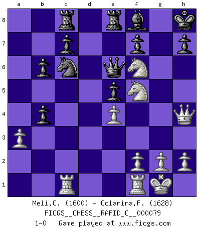 Last move : 1-0 2009 December 14 13:2:25 [Event "FICGS__CHESS__RAPID_C__000079"] [Site "FICGS"] [Date "2009.10.17"] [Round "1"] [White "Meli,Cosimo Leonardo"] [Black "Colarina,Floram"] [Result "1-0"] [WhiteElo "1600"] [BlackElo "1628"] 1.d4 d5 2.c4 e6 3.Nc3 Bb4 4.Nf3 Nf6 5.e3 Nc6 6.Qc2 dxc4 7.Bxc4 O-O 8.Bd2 Bd6 9.a3 e5 10.d5 Na5 11.Be2 b6 12.b4 Nb7 13.O-O Re8 14.Bb5 Bd7 15.Bc6 Rb8 16.e4 Qe7 17.Bg5 Bxc6 18.dxc6 Nd8 19.Nd5 Qe6 20.Bxf6 gxf6 21.Nh4 Rc8 22.Nf5 Bf8 23.Rac1 a5 24.Qd1 Nxc6 25.Qg4+ Kh8 26.Qh4 axb4 27.Nxf6 1-0 QGD : 3.Nc3 Kingside Castling by player Black (move 7) Kingside Castling by player White (move 13) Player White won this chess game. Follow this game move after move (download)Strategy requires thought, tactics require observation. (Max Euwe) Über die Verhaftung Bobby Fischers: Warum es die Bush-Administration für nötig befindet einen 61 Jahre alten Mann zu hetzten, der für niemanden ausser sich selbste eine Gefahr darstellt ist ein Rätsel. (Nigel Short) Después de la respuesta de las negras a 1.e4 con 1..e5, se quedan siempre tratando de entrar dentro del juego. (Howard Staunton) Le jeu d'échecs est comme rejeté hors du temps. (Antoine de Saint-Exupéry) Creativity is allowing yourself to make mistakes. Art is knowing which ones to keep. (Scott Adams)