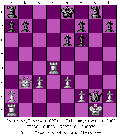 Last move : 0-1 2009 November 2 10:4:12 [Event "FICGS__CHESS__RAPID_C__000079"] [Site "FICGS"] [Date "2009.10.17"] [Round "1"] [White "Colarina,Floram"] [Black "Isliyen,Mehmet"] [Result "0-1"] [WhiteElo "1628"] [BlackElo "1600"] 1.d4 d5 2.c4 Nf6 3.Nc3 e6 4.Bg5 Be7 5.e3 c5 6.Nf3 Nc6 7.dxc5 Bxc5 8.cxd5 Nb4 9.Bb5+ Bd7 10.Bxd7+ Qxd7 11.Bxf6 gxf6 12.O-O Nxd5 13.Qb3 Rg8 14.Rfd1 Qc6 15.Nd4 Bxd4 16.Rxd4 Nxc3 17.bxc3 Qxg2+ 0-1 QGD : Marshall defense Kingside Castling by player White (move 12) Player Black won this chess game. Follow this game move after move (download)I believe that Chess possesses a magic that is also a help in advanced age. A rheumatic knee is forgotten during a game of Chess and other events can seem quite unimportant in comparison with a catastrophe on the chessboard. (Vlastimil Hort) Der Schachmeister von Heute braucht Courage, einen Killerinstinkt, Ausdauer und Arroganz. (Larry Evans) Muchos jugadores de Ajedrez se sorprendían cuando después de la partida, Fischer explicaba con calma: 'Yo ya había analizado esta posibilidad' en una posición en la cual yo creía que no era posible de prever desde la apertura. (Mikhail Tal) Il a essayé de se convaincre qu'il pourrait empêcher toutes les erreurs et ne jamais perdre. L'horreur ! Gary Kasparov au sujet de Robert Fischer. There are two types of people in this world, good and bad. The good sleep better, but the bad seem to enjoy the waking hours much more. (Woody Allen)