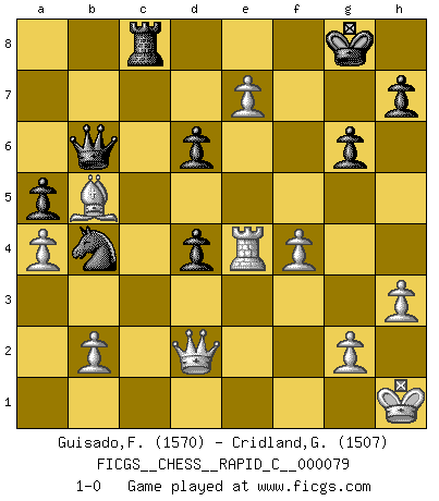 Last move : 1-0 2009 November 17 22:1:52 [Event "FICGS__CHESS__RAPID_C__000079"] [Site "FICGS"] [Date "2009.10.17"] [Round "1"] [White "Guisado,Francisco"] [Black "Cridland,Graham"] [Result "1-0"] [WhiteElo "1570"] [BlackElo "1507"] 1.d4 Nf6 2.c4 c5 3.d5 e6 4.Nc3 exd5 5.cxd5 d6 6.e4 g6 7.f4 Bg7 8.Bb5+ Nfd7 9.a4 O-O 10.Nf3 Na6 11.O-O Nb4 12.Re1 Nf6 13.h3 Bd7 14.Bc4 b5 15.Nxb5 Bxb5 16.Bxb5 Qb6 17.Kh1 Rad8 18.Qe2 Nh5 19.Qf2 f5 20.Ng5 Bd4 21.Be3 Ng7 22.Bxd4 cxd4 23.Qd2 a5 24.Ne6 Nxe6 25.dxe6 Rc8 26.Rac1 fxe4 27.e7 Rfe8 28.Rxc8 Rxc8 29.Rxe4 1-0 Benoni : pawn storm variation Kingside Castling by player Black (move 9) Kingside Castling by player White (move 11) Player White won this chess game. Follow this game move after move (download)With or without the title, Bobby Fischer was unquestionably the greatest player of his time. (Burt Hochberg) Konzentriere dich auf materielle Gewinne. Nimm, was dir dein Gegner gibt, ausser es gibt einen guten Grund der dagegenspricht. (Robert James Fischer) Aún deseo matar a Fischer. (Boris Spassky) Pour se monter efficace, un Cavalier a besoin d'avant-postes ! Les Cavaliers font les meilleurs bloqueurs de pions passés. A good player is always lucky. (Capablanca)