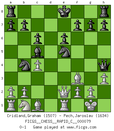 Last move : 0-1 2009 December 8 17:31:41 [Event "FICGS__CHESS__RAPID_C__000079"] [Site "FICGS"] [Date "2009.10.17"] [Round "1"] [White "Cridland,Graham"] [Black "Pech,Jaroslav"] [Result "0-1"] [WhiteElo "1507"] [BlackElo "1634"] 1.e4 Nf6 2.e5 Nd5 3.d4 d6 4.Nf3 Bg4 5.Be2 e6 6.h3 Bxf3 7.Bxf3 c6 8.O-O dxe5 9.dxe5 Nd7 10.Re1 Bc5 11.c4 Qh4 12.Qc2 Nb4 13.Qe2 Nxe5 0-1 Alekhine's defense : Modern variation, 4...Bg4 Kingside Castling by player White (move 8) Player Black won this chess game. Follow this game move after move (download)Up to this point White has been following well-known analysis. But now he makes a fatal error: he begins to use his own head. (Siegbert Tarrasch) Das Schachspiel hat wie die Liebe, die Musik, die Fähigkeit, den Menschen glücklich zu machen. Ich habe ein leises Gefühl des Bedauerns für jeden, der das Schachspiel nicht kennt, so wie ich jeden bedaure, der die Liebe nicht kennt. (Siegbert Tarrasch) Cuando tengas duda... ¡juega al Ajedrez!. (Tevis) Les Echecs ont trois composantes : le temps, l'espace et le matériel en dernier. (Mikhail Tal) Now be brave and don't look back. Don't look back. (Shmi Skywalker in Star Wars ep.1)