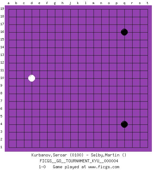 Last move : 1-0 2006 September 30 21:21:53 [Event "FICGS__GO__TOURNAMENT_KYU__000004"] [Site "FICGS"] [Date "2006.09.29"] [Round "1"] [Black "Kurbanov,Seroar"] [White "Selby,Martin"] [Result "1-0"] [Rating 1 "0100"] 1.q4 d10 2.q16 1-0 Here are the names of the openings (joseki) played in the four corners : Corner q4 : q4 1-0 Hoshi (Hwajeom, Seongjeom, Xingwei`) 4-4 Point. The star or hoshi (4-4) point, emphasizing influence at the potential expense of territory. Player Black won this Go (weiqi, baduk) game. Follow this game move after move (download)Play slow, win slow; play fast, lose fast. (Anonymous) When you don't know what to do, walk fast and look worried. (Anonymous)