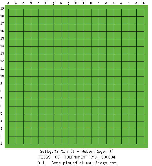Last move : 0-1 2006 September 29 13:19:13 [Event "FICGS__GO__TOURNAMENT_KYU__000004"] [Site "FICGS"] [Date "2006.09.29"] [Round "1"] [Black "Selby,Martin"] [White "Weber,Roger"] [Result "0-1"] 0-1 Here are the names of the openings (joseki) played in the four corners : Player White won this Go (weiqi, baduk) game. Follow this game move after move (download)Win the early ko to win the game. (Anonymous) History is the quarrels of popes and kings, with wars or pestilences in every page; the men all so good for nothing, and hardly any women at all. (Jane Austen)