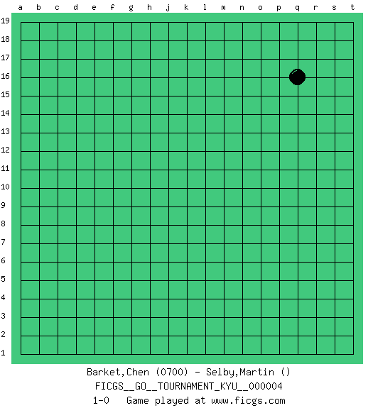 Last move : 1-0 2006 September 30 17:28:29 [Event "FICGS__GO__TOURNAMENT_KYU__000004"] [Site "FICGS"] [Date "2006.09.29"] [Round "1"] [Black "Barket,Chen"] [White "Selby,Martin"] [Result "1-0"] [Rating 1 "0700"] 1.q16 1-0 Here are the names of the openings (joseki) played in the four corners : Player Black won this Go (weiqi, baduk) game. Follow this game move after move (download)Beware of the clumsy double contact. (Anonymous) Wisdom doesn't necessarily come with age. Sometimes age just shows up all by itself. (Tom Watson)