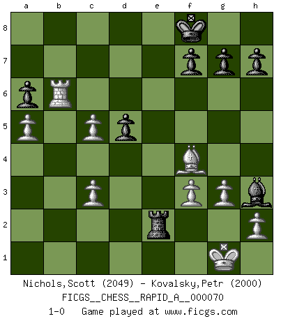 Last move : 1-0 2009 November 11 7:18:31 [Event "FICGS__CHESS__RAPID_A__000070"] [Site "FICGS"] [Date "2009.10.18"] [Round "1"] [White "Nichols,Scott"] [Black "Kovalsky,Petr"] [Result "1-0"] [WhiteElo "2049"] [BlackElo "2000"] 1.e4 e5 2.Nf3 Nc6 3.Bb5 a6 4.Ba4 Nf6 5.O-O Be7 6.Re1 b5 7.Bb3 O-O 8.c3 d5 9.exd5 Nxd5 10.Nxe5 Nxe5 11.Rxe5 c6 12.d4 Bd6 13.Re1 Qh4 14.g3 Qh3 15.Be3 Bg4 16.Qd3 Rae8 17.Nd2 Re6 18.a4 b4 19.Qf1 bxc3 20.Qxh3 Bxh3 21.bxc3 Rfe8 22.a5 Bf4 23.Bxd5 cxd5 24.Nb3 Bd6 25.Nc5 Rg6 26.Bf4 Rxe1+ 27.Rxe1 Bxc5 28.dxc5 Re6 29.Rb1 Kf8 30.f3 Re2 31.Rb6 1-0 Ruy Lopez : Closed, 7...O-O Kingside Castling by player White (move 5) Kingside Castling by player Black (move 7) Player White won this chess game. Follow this game move after move (download)A great player and a great example for many. His book My 60 Memorable Games had a big impact on me. It is a shame he didn't continue to enrich the world of chess with his unparalleled understanding after 1972. (Jan Timman, about Bobby Fischer's death) Schach ist ein Teil der Kultur, und wenn es mit der Kultur abwärts geht, geht es auch mit dem Schach abwärts. (Mikhail Moiseyevich Botvinik) Las combinaciones han sido siempre el aspecto más intrigante del Ajedrez. Los Maestros las buscan, el público las aplauden, los críticos las alaban. La razón se debe a que las combinaciones hacen posible que el Ajedrez sea más que un ejercicio matemático con una carencia de vida. Ellas son la poesía del juego, son del Ajedrez lo que la melodía es de la música. Ellas representan el triunfo de la mente sobre la materia. (Reuben Fine) Les échecs, c'est l'imagination. (David Bronstein) Political correctness is subjecting us to gross incompetence. (Johann Piek)