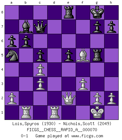 Last move : 0-1 2009 December 6 15:55:58 [Event "FICGS__CHESS__RAPID_A__000070"] [Site "FICGS"] [Date "2009.10.18"] [Round "1"] [White "Lois,Spyros"] [Black "Nichols,Scott"] [Result "0-1"] [WhiteElo "1930"] [BlackElo "2049"] 1.e4 c5 2.Nf3 e6 3.d4 cxd4 4.Nxd4 a6 5.c4 Qc7 6.Nc3 Nf6 7.Be2 Bb4 8.Qd3 O-O 9.O-O d6 10.Qg3 Bxc3 11.bxc3 Nxe4 12.Qe3 f5 13.f3 Nc5 14.Rd1 b6 15.Nb3 Nc6 16.Nxc5 dxc5 17.Bd3 e5 18.Qe2 Bb7 19.Rb1 Na5 20.Qb2 Rf6 21.Qe2 Re8 22.Bg5 Rg6 23.Bxf5 Rxg5 0-1 Sicilian : Kan, Maroczy bind (Reti variation) Kingside Castling by player Black (move 8) Kingside Castling by player White (move 9) Player Black won this chess game. Follow this game move after move (download)By this measure (on the gap between Fischer & his contemporaries), I consider him the greatest world champion. (Garry Kasparov) Wir können eben der zündenden Macht des Opfers nicht wiederstehen, denn die Begeisterung für das Opfer liegt in der Natur des Menschen. (Rudolf Spielmann) La batalla por la última verdad nunca sera ganada. Y es por eso que el Ajedrez es tan fascinante. (Hans Kmoch) Je crois qu'il existe des manières très spécifiques de jouer efficacement contre une machine. Evidemment, nous n'avons aucune chance en technique pure, parce que l'ordinateur calcule de manière parfaite. Mais lorsque nous faisons appel à notre cerveau, en utilisant l'intuition et la compréhension, alors nous restons beaucoup plus forts. (Anatoli Karpov) A clear conscience is usually the sign of a bad memory. (Unknown)