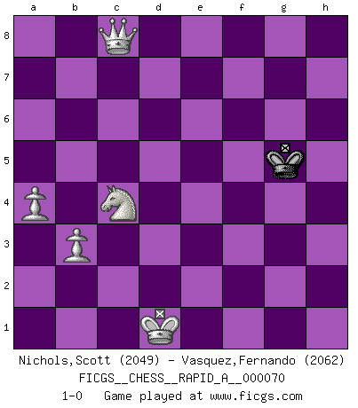 Last move : 1-0 2010 January 28 21:40:36 [Event "FICGS__CHESS__RAPID_A__000070"] [Site "FICGS"] [Date "2009.10.18"] [Round "1"] [White "Nichols,Scott"] [Black "Vasquez,Fernando"] [Result "1-0"] [WhiteElo "2049"] [BlackElo "2062"] 1.e4 e5 2.Nf3 Nf6 3.Nxe5 d6 4.Nf3 Nxe4 5.c4 Nc6 6.d3 Nf6 7.Be2 d5 8.O-O Be7 9.d4 O-O 10.Nc3 Be6 11.c5 Ne4 12.Bd3 f5 13.Bb5 Bf6 14.Bxc6 bxc6 15.Bf4 Rb8 16.Qc2 Qe7 17.Rfe1 Bf7 18.Ne5 g5 19.Nxe4 fxe4 20.Bg3 Qe6 21.Qd2 h5 22.h3 h4 23.Bh2 Bh5 24.Re3 g4 25.hxg4 Bxg4 26.f3 Bf5 27.Ra3 exf3 28.gxf3 Rb7 29.Kh1 Kh7 30.Re1 Qe8 31.Qf2 h3 32.Ra6 Qh5 33.Rxc6 Bg5 34.Qe2 Re8 35.b3 a5 36.Bg1 Re7 37.Be3 Rb8 38.Bxg5 Qxg5 39.Rg1 Qh4 40.Rg4 Bxg4 41.Qc2+ Kg7 42.Rg6+ Kf8 43.Rxg4 Qh7 44.Ng6+ Ke8 45.Rh4 Qf7 46.Rh8+ Kd7 47.c6+ Kd6 48.Qh2+ Kxc6 49.Nxe7+ Kb7 50.Rxb8+ Kxb8 51.Nc6+ Kc8 52.Qxh3+ Qd7 53.Qxd7+ Kxd7 54.Nxa5 c5 55.dxc5 d4 56.Kg2 Ke6 57.c6 Ke7 58.f4 d3 59.Kf3 d2 60.Ke2 d1Q+ 61.Kxd1 Kd6 62.f5 Kc7 63.f6 Kd6 64.f7 Ke7 65.c7 Kxf7 66.c8Q Kf6 67.Nc4 Kg5 68.a4 1-0 Petrov : Kaufmann attack Kingside Castling by player White (move 8) Kingside Castling by player Black (move 9) 10 pieces endgame at move 53 : White KNPPPP , Black KPPP WHITE : King + 1 Knight 4 Pawns BLACK : King + 3 Pawns 9 pieces endgame at move 54 : White KNPPPP , Black KPP WHITE : King + 1 Knight 4 Pawns BLACK : King + 2 Pawns 8 pieces endgame at move 55 : White KNPPPP , Black KP WHITE : King + 1 Knight 4 Pawns BLACK : King + 1 Pawn Promotion Queen by player Black (move 60) 7 pieces endgame at move 61 : White KNPPPP , Black K WHITE : King + 1 Knight 4 Pawns BLACK : King + 6 pieces endgame at move 65 : White KNPPP , Black K WHITE : King + 1 Knight 3 Pawns BLACK : King + Promotion Queen by player White (move 66) Player White won this chess game. Follow this game move after move (download)The only thing Chess players have in common is Chess. (Lodewijk Prins) Garry Kasparov war erst in der Großmeister-Organisation GMA, dann in der Profischach-Vereinigung PCA, zum Schluss kehrte er wieder in den Schoß der FIDE zurück. Aber gut, manche Leute sind flexibel (Viswanathan Anand) Muchos jugadores de Ajedrez se sorprendían cuando después de la partida, Fischer explicaba con calma: 'Yo ya había analizado esta posibilidad' en una posición en la cual yo creía que no era posible de prever desde la apertura. (Mikhail Tal) Je ne suis pas le dernier à jouer lâchement des coups douteux pendant le zeïtnot de l'adversaire pour l'achever: en effet les coups qui font le plus peur sont ceux que l'on ne comprend pas. Je me fais souvent peur quand je joue. (Un professeur anonyme) Life is painting a picture, not doing a sum. (Oliver Wendell Holmes, Jr.)