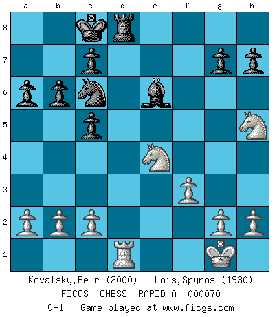Last move : 0-1 2009 December 5 19:41:48 [Event "FICGS__CHESS__RAPID_A__000070"] [Site "FICGS"] [Date "2009.10.18"] [Round "1"] [White "Kovalsky,Petr"] [Black "Lois,Spyros"] [Result "0-1"] [WhiteElo "2000"] [BlackElo "1930"] 1.e4 e5 2.Nf3 Nc6 3.Bb5 a6 4.Bxc6 dxc6 5.O-O f6 6.d4 exd4 7.Nxd4 c5 8.Ne2 Qxd1 9.Rxd1 Bd7 10.Be3 O-O-O 11.Nbc3 Bd6 12.Bf4 Bxf4 13.Nxf4 Ne7 14.f3 f5 15.Nh5 Rhg8 16.Rd3 Nc6 17.Rad1 b6 18.R3d2 fxe4 19.Nxe4 Be6 20.Rxd8+ Rxd8 0-1 Ruy Lopez : Exchange, Gligoric variation Kingside Castling by player White (move 5) Queenside Castling by player Black (move 10) Player Black won this chess game. Follow this game move after move (download)In life, as in Chess, one's own Pawns block one's way. A man's very wealth, ease, leisure, children, books, which should help him to win, more often checkmate him. (Charles Buxton) Es gibt Leute, die glauben, alles wäre vernünftig, was man mit einem ernsthaften Gesicht tut. (Georg Christoph Lichtenberg) Cuando tengas duda... ¡juega al Ajedrez!. (Tevis) Tous ces prétendus hommes politiques sont les pions, les Cavaliers, les Tours ou les Fous d'une partie d'échecs qui se jouera tant qu'un hasard ne renversera pas l'échiquier. (Honoré de Balzac) I just play for fun. (Anna Kournikova)