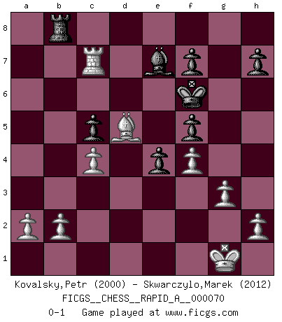Last move : 0-1 2010 February 16 20:51:44 [Event "FICGS__CHESS__RAPID_A__000070"] [Site "FICGS"] [Date "2009.10.18"] [Round "1"] [White "Kovalsky,Petr"] [Black "Skwarczylo,Marek"] [Result "0-1"] [WhiteElo "2000"] [BlackElo "2012"] 1.e4 c5 2.Nf3 Nc6 3.d4 cxd4 4.Nxd4 Nf6 5.Nc3 e5 6.Ndb5 d6 7.Bg5 a6 8.Na3 b5 9.Bxf6 gxf6 10.Nd5 f5 11.Bd3 Be6 12.O-O Bxd5 13.exd5 Ne7 14.Nxb5 Bg7 15.Nc3 e4 16.Bc4 Qc7 17.Qe2 O-O 18.Na4 Ng6 19.Bb3 Rfe8 20.f4 Qe7 21.g3 Nf8 22.c3 Nd7 23.Kh1 Kh8 24.Rad1 Qd8 25.Qh5 Qf6 26.Rd4 Rec8 27.Rb4 Rab8 28.Rxb8 Rxb8 29.Qe2 Nc5 30.Nxc5 dxc5 31.Rd1 Bf8 32.d6 Bxd6 33.Qxa6 Be7 34.Qa7 Re8 35.Ba4 Rf8 36.Qc7 Kg7 37.Bb3 Re8 38.Kg2 Qa6 39.Kf2 Qh6 40.Kg1 Qa6 41.Rd2 Qc8 42.Rd7 Qxc7 43.Rxc7 Kf6 44.Bd5 Rd8 45.c4 Rb8 0-1 This chess game has been lost on time (started : 2009.10.18 17:29:1) Sicilian : Pelikan (Lasker/Sveshnikov) variation Kingside Castling by player White (move 12) Kingside Castling by player Black (move 17) Player Black won this chess game. Follow this game move after move (download)Human affairs are like a Chess game: only those who do not take it seriously can be called good players. (Hung Tzu Ch'eng) Die unerbitterlichsten Regeln im Schach sind die Ausnahmen. (Savielly Grigorievitsch Tartakower) La maestría del Ajedrez consiste esencialmente en analizar posiciónes de Ajedrez con precisión. (Mikhail Botvinnik) Les pièces de l'échiquier étaient impitoyables. Elles le retenaient, elles l'absorbaient. Il y avait de l'horreur en cela, mais aussi une harmonie unique. Car, qu'y a-t-il dans le monde, à part les échecs ? (V. Nabokov) The good fighters of old first put themselves beyond the possibility of defeat, and then waited for an opportunity of defeating the enemy. (Sun Tzu)