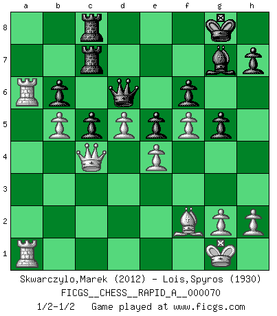 Last move : 1/2-1/2 2010 March 10 6:15:49 [Event "FICGS__CHESS__RAPID_A__000070"] [Site "FICGS"] [Date "2009.10.18"] [Round "1"] [White "Skwarczylo,Marek"] [Black "Lois,Spyros"] [Result "1/2-1/2"] [WhiteElo "2012"] [BlackElo "1930"] 1.d4 Nf6 2.Nf3 g6 3.c4 Bg7 4.Nc3 d5 5.cxd5 Nxd5 6.e4 Nxc3 7.bxc3 c5 8.Be3 Qa5 9.Qd2 O-O 10.Rc1 Bg4 11.d5 Nd7 12.c4 Qa3 13.Be2 Rad8 14.O-O b6 15.Rfe1 Bxf3 16.Bxf3 Bb2 17.Rc2 Be5 18.Be2 Bg7 19.f4 e5 20.Rc3 Qb4 21.f5 Nf6 22.Bd3 Ng4 23.Bg5 f6 24.Rb3 Qa4 25.Bh4 g5 26.Bg3 Nh6 27.Qb2 Nf7 28.Ra3 Qd7 29.Rb1 Nd6 30.Qe2 Qb7 31.Be1 Rc8 32.Bc2 Rc7 33.Ba4 Qa6 34.Rc1 Bh6 35.R1c3 Qc8 36.Rh3 Bg7 37.Kh1 R8f7 38.Rab3 Bf8 39.Rb1 Rb7 40.Bb5 Nxb5 41.cxb5 Rbc7 42.Qc4 Bd6 43.a4 Qd7 44.Bf2 Rc8 45.Kg1 Bf8 46.a5 Qd6 47.axb6 axb6 48.Ra1 Rfc7 49.Rha3 Bg7 50.Ra6 1/2-1/2 King's Indian : East Indian defense Kingside Castling by player Black (move 9) Kingside Castling by player White (move 14) This chess game ended in a draw. Follow this game move after move (download)Best by test: 1. e4 (Bobby Fischer) Du musst nicht gut spielen, es reicht, wenn du besser spielst als dein Gegner. (Anonymous) El Jaque al descubierto es el bombardero del tablero. (Reuben Fine) Les Echecs sont affaire de jugement sensible. Savoir quand frapper et quand esquiver. (Fischer) Panic is a sudden desertion of us, an a going over to the enemy of our imagination. (Christian Nevell Bovee)