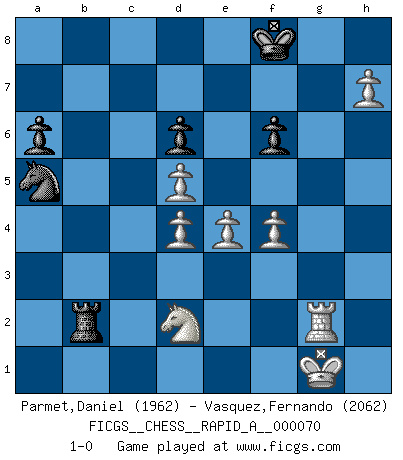 Last move : 1-0 2010 March 6 9:3:59 [Event "FICGS__CHESS__RAPID_A__000070"] [Site "FICGS"] [Date "2009.10.18"] [Round "1"] [White "Parmet,Daniel"] [Black "Vasquez,Fernando"] [Result "1-0"] [WhiteElo "1962"] [BlackElo "2062"] 1.d4 d5 2.Nf3 Nc6 3.c4 e6 4.Nc3 Nf6 5.Bg5 Bb4 6.e3 h6 7.Bh4 g5 8.Bg3 Ne4 9.Qc2 h5 10.h3 Nxc3 11.bxc3 Bd6 12.Bxd6 cxd6 13.cxd5 exd5 14.Qb3 Rg8 15.Qxd5 Be6 16.Qb5 Qa5 17.Kd2 Ke7 18.Qxb7+ Bd7 19.Qb5 Rab8 20.Qxa5 Nxa5 21.c4 Rb2+ 22.Ke1 Kf6 23.Nd2 Bf5 24.g4 Bg6 25.gxh5 Bxh5 26.h4 g4 27.Rg1 Nc6 28.Bd3 Nb4 29.Bb1 Ke7 30.Kd1 g3 31.f3 Nc6 32.Bh7 Rg7 33.Be4 Na5 34.Kc1 Rb4 35.Rb1 Rxb1+ 36.Kxb1 f6 37.Kc2 Bf7 38.Kd3 Rg8 39.Bd5 g2 40.Ke2 Bxd5 41.cxd5 Kf7 42.Kf2 Rb8 43.Rxg2 Rb5 44.e4 Rb2 45.Kg1 Rxa2 46.h5 Rb2 47.h6 a6 48.f4 Kf8 49.h7 1-0 Queen's pawn game, Chigorin variation Player White won this chess game. Follow this game move after move (download)It is always better to sacrifice your opponent's men. (Savielly Tartakower) Obwohl ich alt bin, darf mir niemand den Finger in den Mund stecken, sonst beisse ich. (Wilhelm Steinitz) Aquel que toma al Peón de Caballo de la Reina, se pasará la noche a dormir en la calle. (Anónimo) Même un GMI sait rarement calculer sur plus de cinq coups une attaque à sacrifices. (Rudolf Spielmann) A good book on your shelf is a friend that turns its back on you and remains a friend. (Author unknown)