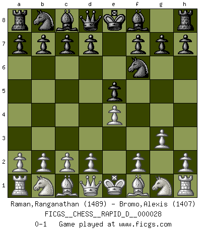 Last move : 0-1 2009 November 22 20:42:20 [Event "FICGS__CHESS__RAPID_D__000028"] [Site "FICGS"] [Date "2009.10.20"] [Round "1"] [White "Raman,Ranganathan"] [Black "Bromo,Alexis"] [Result "0-1"] [WhiteElo "1489"] [BlackElo "1407"] 1.g3 e5 2.e4 Nf6 0-1 This chess game has been lost on time (started : 2009.10.20 8:47:5) Benko's Opening Player Black won this chess game. Follow this game move after move (download)Combinations have always been the most intriguing aspect of Chess. The masters look for them, the public applauds them, the critics praise them. It is because combinations are possible that Chess is more than a lifeless mathematical exercise. They are the poetry of the game; they are to Chess what melody is to music. They represent the triumph of mind over matter. (Reuben Fine) Dein Körper muss in Topform sein. Dein Schach verfällt, wenn dein Körper verfällt. Der Körper kann nicht vom Geist getrennt werden. (Robert James Fischer) Un juego de Ajedrez es un dialogo, una conversación entre un jugador y su oponente. Cada movimiento del oponente puede contener amenazas o tropiezos, pero un jugador no se puede defender de las amenazas o tomar ventaja de los tropiezos si es que no se pregunta a sí mismo: ¿Que es lo que mi oponente va a hacer después de cada movida?. (Bruce A. Moon) Plusieurs personnes se sont demandées comment Tal faisait pour gagner... En fait, c'est très simple ! Il met ses pièces au centre de l'échiquier et les sacrifie quelque part ! (David Bronstein) Memory is a way of holding onto the things you love, the things you are, the things you never want to lose. (from the television show: The Wonder Years)