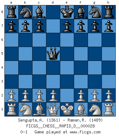 Last move : 0-1 2009 December 21 7:55:39 [Event "FICGS__CHESS__RAPID_D__000028"] [Site "FICGS"] [Date "2009.10.20"] [Round "1"] [White "Sengupta,Arnab"] [Black "Raman,Ranganathan"] [Result "0-1"] [WhiteElo "1361"] [BlackElo "1489"] 1.e4 d5 2.exd5 Qxd5 0-1 This chess game has been lost on time (started : 2009.10.20 8:47:5) Scandinavian (centre counter) defense Player Black won this chess game. Follow this game move after move (download)I'm not afraid of Spassky. The world knows I'm the best. You don't need a match to prove it. (Bobby Fischer) Sicherlich können nur Meister einen Stil haben. Daß ein nicht-Meister auch nur ein einziges Mal in seinem Leben eine Partie folgerecht durchführte, habe ich niemals bemerkt. (Emanuel Lasker) Los problemas de Ajedrez exigen del compositor las mismas virtudes que caracterizan todo el arte de valor: originalidad, invención, concisión, armonía, complejidad e insinceridad explendida. (Vladimir Nabokov) On est toujours la mazette de quelqu'un d'autre. (Anonyme) Luck never made a man wise. (Seneca, Letters to Lucilius)