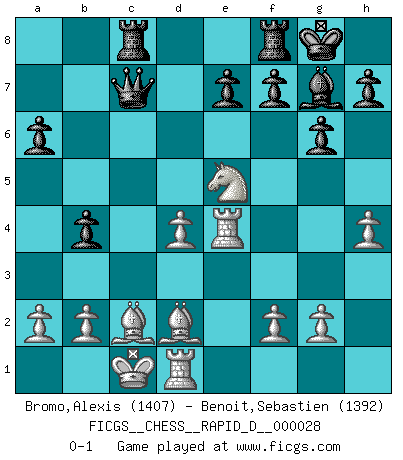 Last move : 0-1 2009 November 17 19:9:31 [Event "FICGS__CHESS__RAPID_D__000028"] [Site "FICGS"] [Date "2009.10.20"] [Round "1"] [White "Bromo,Alexis"] [Black "Benoit,Sebastien"] [Result "0-1"] [WhiteElo "1407"] [BlackElo "1392"] 1.d4 Nf6 2.c4 c5 3.e3 g6 4.Nc3 Bg7 5.Bd2 O-O 6.Qc2 cxd4 7.exd4 d5 8.O-O-O Nc6 9.Nf3 dxc4 10.Bxc4 Bf5 11.Bd3 Nb4 12.Bxf5 Nxc2 13.Bxc2 Rc8 14.Rhe1 a6 15.h4 b5 16.Ne5 b4 17.Ne4 Nxe4 18.Rxe4 Qc7 0-1 Benoni defense Kingside Castling by player Black (move 5) Queenside Castling by player White (move 8) Player Black won this chess game. Follow this game move after move (download)Everything is in a state of flux, and this includes the world of Chess. (Mikhail Botvinnik) Die starken Figuren des Gegners muss man abtauschen. (José Raúl Capablanca) Ciertamente el estado mental actual de Bobby Fischer es una tragedia. Uno de los mas grandes jugadores de Ajedrez del mundo -el orgullo y pena del Ajedrez Americano. (Frank Brady) Dieu déplace le joueur, et celui-ci la pièce. Quel Dieu derrière Dieu commence donc la trame ? Arturo Perez-Reverte (prix de littérature policière 1993). Over-the-board chess is the favorite of mortals, correspondence chess is the favorite of the gods. (Eduard Dyckhoff)