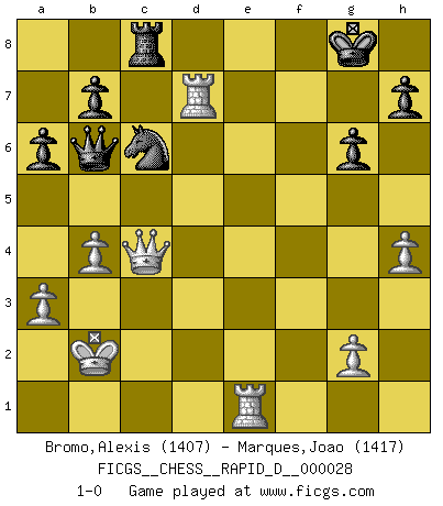 Last move : 1-0 2010 January 11 20:43:38 [Event "FICGS__CHESS__RAPID_D__000028"] [Site "FICGS"] [Date "2009.10.20"] [Round "1"] [White "Bromo,Alexis"] [Black "Marques,Joao"] [Result "1-0"] [WhiteElo "1407"] [BlackElo "1417"] 1.d4 Nf6 2.c4 e6 3.Nc3 d5 4.e3 c5 5.Nf3 cxd4 6.exd4 dxc4 7.Bxc4 Bb4 8.Bd2 O-O 9.Qc2 Nc6 10.Be3 a6 11.a3 Ba5 12.b4 Bb6 13.O-O-O Qe7 14.d5 Bxe3+ 15.fxe3 exd5 16.Nxd5 Nxd5 17.Bxd5 Qxe3+ 18.Kb2 Bd7 19.h4 Rac8 20.Ng5 g6 21.Rhe1 Qb6 22.Bxf7+ Rxf7 23.Nxf7 Kxf7 24.Rxd7+ Kg8 25.Qc4+ 1-0 This chess game has been lost on time (started : 2009.10.20 8:47:5) Queen's pawn game Kingside Castling by player Black (move 8) Queenside Castling by player White (move 13) Player White won this chess game. Follow this game move after move (download)I like to say that Bobby Fischer was the greatest player ever. But what made Fischer a genius was his ability to blend an American freshness and pragmatism with Russian ideas about strategy. (Bruce Pandolfini) Gott hat gewollt, dass ich Champion werde. (Surab Azmajparaschvili) Aquellos que dicen entender al Ajedrez, no entienden nada. (Robert Hubner) Des idées, des idées, j'en ai cent, j'en ai mille. Des bonnes, des mauvaises, applicables, irréalisables... Il suffit de faire le tri ! (Roos) Happy endings are just stories that haven't finished yet. (Jane Smith in Mr & Mrs Smith)