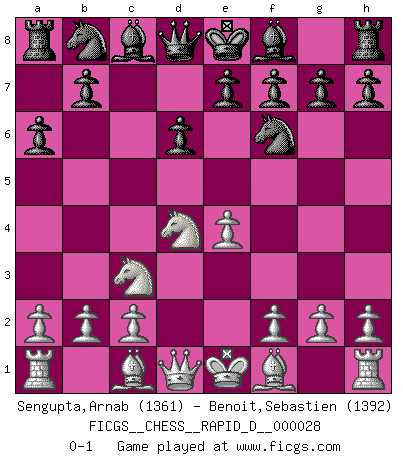 Last move : 0-1 2009 November 25 20:48:6 [Event "FICGS__CHESS__RAPID_D__000028"] [Site "FICGS"] [Date "2009.10.20"] [Round "1"] [White "Sengupta,Arnab"] [Black "Benoit,Sebastien"] [Result "0-1"] [WhiteElo "1361"] [BlackElo "1392"] 1.e4 c5 2.Nf3 d6 3.d4 cxd4 4.Nxd4 Nf6 5.Nc3 a6 0-1 This chess game has been lost on time (started : 2009.10.20 8:47:5) Sicilian : Najdorf Player Black won this chess game. Follow this game move after move (download)The winner of the game is the player who makes the next-to-last mistake. (Savielly Tartakover) Verschiedene, sehr schätzbare und im Laufe des Lebens nützliche Eigenschaften des Geistes können durch das Schachspiel erworben und gekräftigt werden, so dass sie zu Gewohnheiten werden, die uns nie im Stich lassen. (Benjamin Franklin) Un mal plan es mejor que no tener ningún plan. (Frank Marshall) On n'a jamais que l'âge auquel on a commence à jouer aux échecs car après on cesse de vieillir. (Capablanca) You must do what you feel is right... of course. (Obi-Wan Kenobi in Star Wars ep.4)