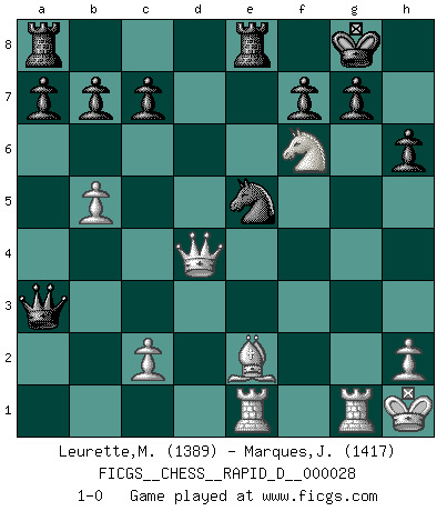 Last move : 1-0 2009 December 8 10:48:43 [Event "FICGS__CHESS__RAPID_D__000028"] [Site "FICGS"] [Date "2009.10.20"] [Round "1"] [White "Leurette,Marc-Antoine"] [Black "Marques,Joao"] [Result "1-0"] [WhiteElo "1389"] [BlackElo "1417"] 1.e4 e5 2.Nf3 Nc6 3.d4 exd4 4.Nxd4 d6 5.Nc3 Nf6 6.Be2 Be7 7.O-O O-O 8.Be3 Bd7 9.f4 h6 10.e5 dxe5 11.Nxc6 Bxc6 12.fxe5 Nd7 13.Bd4 Bb4 14.a3 Ba5 15.b4 Bb6 16.b5 Bxg2 17.Kxg2 Qg5+ 18.Kh1 Bxd4 19.Qxd4 Nxe5 20.Rg1 Qe7 21.Rae1 Rfe8 22.Nd5 Qxa3 23.Nf6+ 1-0 Scotch game Kingside Castling by player White (move 7) Kingside Castling by player Black (move 7) Player White won this chess game. Follow this game move after move (download)There's never before been a Chess player with such a thorough knowledge of the intricacies of the game and such an absolutely indomitable will to win. I think Bobby is the greatest player that ever lived. (Lisa Lane) Besser ein falscher Plan, logisch durchgeführt, als gar kein Plan. (Viktor Kortschnoi) Es muy difícil jugar en contra de la teoría de Einstein. - en su primera derrota en contra de Fischer (Mikhail Tal) Je ne crois pas en la psychologie, je crois aux bons coups. (Robert Fischer) I'll be back. (Arnold Schwarzenegger)