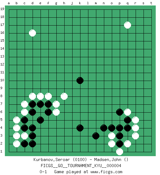 Last move : 0-1 2006 November 26 21:38:27 [Event "FICGS__GO__TOURNAMENT_KYU__000004"] [Site "FICGS"] [Date "2006.09.29"] [Round "1"] [Black "Kurbanov,Seroar"] [White "Madsen,John"] [Result "0-1"] [Rating 1 "0100"] 1.d4 q17 2.q4 d16 3.k10 c6 4.e5 o3 5.k4 q2 6.m3 r3 7.p4 r4 8.o4 q6 9.n4 c3 10.c4 b4 11.d3 b2 12.c5 b5 13.d6 c7 14.d7 d8 15.p3 o2 16.p2 p1 17.q5 r5 18.p6 f8 19.d2 g6 20.c2 b3 21.e7 e8 22.f7 g7 23.f6 h8 0-1 This go game has been lost on time (started : 2006.09.29 8:11:6) Here are the names of the openings (joseki) played in the four corners : Corner d4 : d4 c6 Hoshi (Hwajeom, Seongjeom, Xingwei`) 4-4 Point. The star or hoshi (4-4) point, emphasizing influence at the potential expense of territory. Ikken Kakari (Hankan Keolch'im, Yi Gua`jiao~, 1-Space Low Approach). White 2 is the standard approach move to the 4-4. Corner q4 : q4 o3 Hoshi (Hwajeom, Seongjeom, Xingwei`) 4-4 Point. The star or hoshi (4-4) point, emphasizing influence at the potential expense of territory. Ikken Kakari (Hankan Keolch'im, Yi Gua`jiao~, 1-Space Low Approach). White 2 is the standard approach move to the 4-4. Player White won this Go (weiqi, baduk) game. Follow this game move after move (download)Each step in a ladder is worth 7 points. (Anonymous) Coffee just isn't my cup of tea. (Unknown)