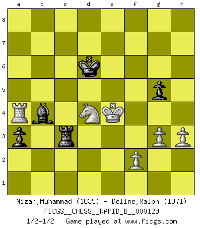 Last move : 1/2-1/2 2010 February 9 7:38:22 [Event "FICGS__CHESS__RAPID_B__000129"] [Site "FICGS"] [Date "2009.10.20"] [Round "1"] [White "Nizar,Muhammad"] [Black "Deline,Ralph"] [Result "1/2-1/2"] [WhiteElo "1835"] [BlackElo "1871"] 1.d4 Nf6 2.c4 g6 3.Nc3 d5 4.Nf3 Bg7 5.Bg5 Ne4 6.cxd5 Nxg5 7.Nxg5 e6 8.Nf3 exd5 9.e3 O-O 10.Be2 c6 11.O-O Nd7 12.Qc2 Nb6 13.b3 Bf5 14.Bd3 Bg4 15.Be2 Re8 16.h3 Bf5 17.Bd3 Bxd3 18.Qxd3 Nc8 19.b4 Nd6 20.a4 Rc8 21.Rfc1 Ne4 22.Rab1 f5 23.a5 Qd6 24.Na4 f4 25.exf4 Qxf4 26.Nc5 Re7 27.Re1 Rce8 28.b5 Nxc5 29.dxc5 Qc4 30.Qd2 cxb5 31.Rec1 Re2 32.Rxc4 Rxd2 33.Rcb4 Rc2 34.Rxb5 Bf8 35.Ne1 Rce2 36.Kf1 R8e7 37.g3 a6 38.R5b3 Ra2 39.Nd3 Rxa5 40.Kg2 g5 41.R1b2 Rf7 42.Rxb7 Bxc5 43.Rxf7 Kxf7 44.Rb7+ Kf6 45.Rxh7 Bf8 46.Rb7 Ra2 47.Rb6+ Kg7 48.Re6 a5 49.Re5 Kh6 50.Rxd5 a4 51.Rf5 Be7 52.Re5 Bf8 53.Rf5 Be7 54.Ne5 Rc2 55.Rf7 Bb4 56.Nd3 Bd2 57.Ra7 Rc3 58.Ne5 a3 59.Kf1 Rc1+ 60.Ke2 Bb4 61.Ra4 Kg7 62.Kd3 Bc5 63.Ng4 Rd1+ 64.Kc2 Rh1 65.Ra5 Kf7 66.Kb3 Be7 67.Nh6+ Ke6 68.Nf5 Rb1+ 69.Kc4 Rc1+ 70.Kd3 Bb4 71.Nd4+ Kd6 72.Ra4 Rc3+ 73.Ke4 Rc4 74.Kd3 Rc3+ 75.Ke4 1/2-1/2 King's Indian defense, 3.Nc3 Kingside Castling by player Black (move 9) Kingside Castling by player White (move 11) This chess game ended in a draw. Follow this game move after move (download)Modern Chess is too much concerned with things like Pawn structure. Forget it, Checkmate ends the game. (Nigel Short) Immer nach dem besten Zug zu suchen ist ziemlich unpraktisch. (Nigel Short) El Ajedrez es parte de una cultura y si una cultura esta en decadencia, entonces también el Ajedrez declinará. (Mikhail Botvinnik) Dieu déplace le joueur, et celui-ci la pièce. Quel Dieu derrière Dieu commence donc la trame ? Arturo Perez-Reverte (prix de littérature policière 1993). To be champion requires more than simply being a strong player; one has to be a strong human being as well. (Anatoly Karpov)