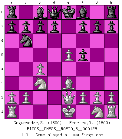 Last move : 1-0 2010 February 5 20:19:16 [Event "FICGS__CHESS__RAPID_B__000129"] [Site "FICGS"] [Date "2009.10.20"] [Round "1"] [White "Geguchadze,Sandro"] [Black "Pereira,Antonio"] [Result "1-0"] [WhiteElo "1800"] [BlackElo "1800"] 1.e4 Nc6 2.d4 Nf6 3.e5 Nd5 4.c4 Nb6 5.Nc3 e6 6.Bd3 Nxd4 7.Be3 Nf5 8.Bxf5 exf5 9.Qe2 1-0 This chess game has been lost on time (started : 2009.10.20 12:2:30) KP : Nimzovich defense Player White won this chess game. Follow this game move after move (download)An attack on the wing should be met by play in the center. (Nimzovitch) Vielleicht wirkt die Aura früherer Spieler glanzvoller als die der heutigen Spieler, aber das liegt daran, dass man kein Programm wie Fritz hatte, das einem all die Löcher in ihren Partien zeigt. (Vladimir Kramnik) Aunque la mayoría de la gente disfruta observar las partidas de los grandes Maestros de ataque, algunos de los jugadores mas notables en la historia han sido los jugadores silenciosos posicionales. Lentamente ellos te aplastan despojandote de tu espacio, congestionando tus piezas y dejandote virtualmente sin nada que hacer. (Yasser Seirawan) Vouloir jouer aux échecs contre soi-même est aussi paradoxal que vouloir marcher sur son ombre. (Stefan Zweig) The obstacle is the path. (Zen proverb)