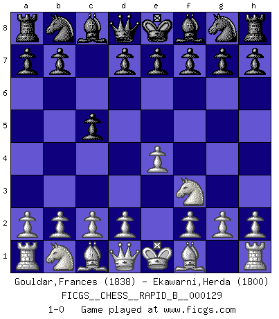 Last move : 1-0 2009 November 20 20:33:44 [Event "FICGS__CHESS__RAPID_B__000129"] [Site "FICGS"] [Date "2009.10.20"] [Round "1"] [White "Gouldar,Frances"] [Black "Ekawarni,Herda"] [Result "1-0"] [WhiteElo "1838"] [BlackElo "1800"] 1.e4 c5 2.Nf3 1-0 This chess game has been lost on time (started : 2009.10.20 12:2:30) Sicilian defense Player White won this chess game. Follow this game move after move (download)Could we look into the head of a Chess player, we should see there a whole world of feelings, images, ideas, emotion and passion. (Alfred Binet) Der Knackpunkt bei der Konzentration ist, daß wir nur durch sie etwas Neues und Ungewöhnliches am Schachbrett finden können. Sie ist der einzige Weg durch neue neue Ideen eine Überraschung zu bereiten. (Garry Kasparov) Yo no creo en la psicología. Yo creo en las buenas movidas. (Bobby Fischer) Si rien de grave n'est détecté lors de l'analyse d'une position, on joue alors le coup. Seconde règle de Blumenfeld. Wipe them out. All of them. (Darth Sidious in Star Wars ep.1)