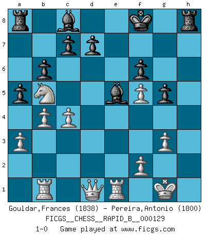 Last move : 1-0 2010 January 12 20:11:24 [Event "FICGS__CHESS__RAPID_B__000129"] [Site "FICGS"] [Date "2009.10.20"] [Round "1"] [White "Gouldar,Frances"] [Black "Pereira,Antonio"] [Result "1-0"] [WhiteElo "1838"] [BlackElo "1800"] 1.e4 e5 2.Nf3 Nc6 3.Bc4 Bc5 4.Nc3 Nf6 5.d3 O-O 6.O-O Qe7 7.Bg5 h6 8.Nd5 Qe6 9.Nxf6+ gxf6 10.Bxe6 fxg5 11.Bf5 f6 12.h4 Kg7 13.hxg5 hxg5 14.a3 Ne7 15.b4 Bd6 16.c4 b6 17.d4 exd4 18.Nxd4 Rh8 19.g3 a5 20.Nb5 Be5 21.Rb1 Nxf5 22.exf5 Kf8 23.Re1 1-0 This chess game has been lost on time (started : 2009.10.20 12:2:30) Giuoco Piano : Four knights variation Kingside Castling by player Black (move 5) Kingside Castling by player White (move 6) Player White won this chess game. Follow this game move after move (download)Chess is really ninety nine percent calculation. (Soltis) Spiel ein langweiliges Spiel zu Ende und lustige Dinge können passieren. (Hans Ree) Buenas posiciones no logran ganar juegos, buenas movidas sí. (Gerald Abrahams) Vous m'avez demandé de vous exposer quel est le fondement de la prière. Je ne fais que préparer les pièces du jeu sur la table... Nous sera-t-il permis d'en adopter les règles et si nous les appliquons scrupuleusement nous ne tarderons pas à faire mat le Roi divin ! Il ne pourra échapper à nos mains. (Sainte Thérèse d'Avila, Chemin de perfection) History is the quarrels of popes and kings, with wars or pestilences in every page; the men all so good for nothing, and hardly any women at all. (Jane Austen)