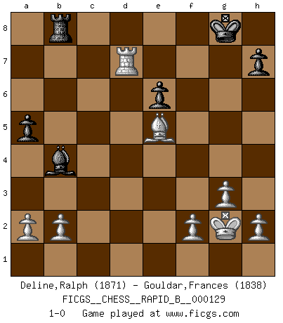 Last move : 1-0 2009 December 3 12:54:5 [Event "FICGS__CHESS__RAPID_B__000129"] [Site "FICGS"] [Date "2009.10.20"] [Round "1"] [White "Deline,Ralph"] [Black "Gouldar,Frances"] [Result "1-0"] [WhiteElo "1871"] [BlackElo "1838"] 1.c4 e6 2.g3 d5 3.Bg2 Nf6 4.Nf3 Nc6 5.O-O dxc4 6.Qa4 Qd5 7.Ne1 Qc5 8.d4 cxd3 9.Nxd3 Qd6 10.Nc3 Nd5 11.Nxd5 exd5 12.Bf4 Qd7 13.Rac1 Nd8 14.Qxd7+ Bxd7 15.Bxc7 Bc6 16.Ne5 Ne6 17.Ba5 Nd4 18.Nxc6 Nxc6 19.Bc3 Rd8 20.Rfd1 Ne7 21.Bd4 a6 22.e4 dxe4 23.Bxe4 Rd7 24.Bb6 Rxd1+ 25.Rxd1 Nc6 26.Re1 Kd7 27.Bf5+ Kd6 28.Rd1+ Ke5 29.Bc8 Bc5 30.Bc7+ Kf6 31.Bxb7 Nd4 32.Kg2 Ne6 33.Ba5 Ke7 34.Bc3 a5 35.Bc6 Rb8 36.Rd7+ Kf8 37.Bd5 Bb4 38.Bxe6 fxe6 39.Bxg7+ Kg8 40.Be5 1-0 English Opening Kingside Castling by player White (move 5) Player White won this chess game. Follow this game move after move (download)Dazzling combinations are for the many, shifting wood is for the few. (Georg Kieninger) Im Blitz ist es einfacher mit einer Figur weniger anzugreifen, als sich mit einer Mehrfigur zu verteidigen. (Mikhail Nekhemyevich Tal) Juega la Apertura como un libro, el Juego Medio como un mago y los Finales como una máquina. (Spielmann) Le plus grand jeu de l'esprit jamais inventé, plus vous l'apprenez, plus vous y prenez du plaisir. (Garry Kasparov) Horse racing is animated roulette. (Roger Kahn)
