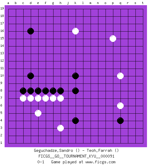 Last move : 0-1 2010 February 4 8:20:2 [Event "FICGS__GO__TOURNAMENT_KYU__000091"] [Site "FICGS"] [Date "2009.10.20"] [Round "1"] [Black "Geguchadze,Sandro"] [White "Teoh,Farrah"] [Result "0-1"] 1.k10 p15 2.d16 e5 3.q4 q10 4.k4 h3 5.d10 k16 6.e8 d7 7.d8 c7 8.c8 e7 9.f8 f7 10.g8 g7 11.h8 h7 12.k8 q6 0-1 This go game has been lost on time (started : 2009.10.20 19:37:27) Here are the names of the openings (joseki) played in the four corners : Corner q4 : q4 q6 Hoshi (Hwajeom, Seongjeom, Xingwei`) 4-4 Point. The star or hoshi (4-4) point, emphasizing influence at the potential expense of territory. Ikken Takagakari (Hankan Nop'dakeolch'im, Yi Gaojia, 1-Space High Approach). Black typically responds at 6-4 or 3-10. Black 4-10 is played when Black finds play on the right side advantageous. Black 4-8 or 3-8 may be played when Black has support at top. Player White won this Go (weiqi, baduk) game. Follow this game move after move (download)You don't have to be really good anymore to get good results. What's happening with chess is that it's gradually losing its place as the par excellence of intellectual activity. Smart people in search of a challenging board game might try a game called Go. (Hans Berliner, The New York Times, 2003) The arrogant army will lose certainly the battle. (Chinese proverb)