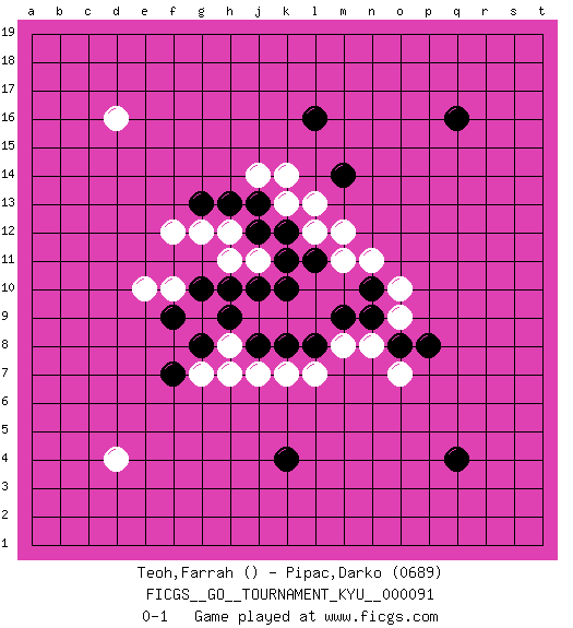 Last move : 0-1 2009 December 31 8:18:31 [Event "FICGS__GO__TOURNAMENT_KYU__000091"] [Site "FICGS"] [Date "2009.10.20"] [Round "1"] [Black "Teoh,Farrah"] [White "Pipac,Darko"] [Result "0-1"] [Rating 2 "0689"] 1.q4 d16 2.q16 d4 3.k4 k7 4.k10 m12 5.k12 k13 6.j12 h12 7.j10 h11 8.h10 j11 9.k11 l12 10.j13 k14 11.h13 g12 12.m14 l13 13.l16 j14 14.g13 f12 15.k8 j7 16.j8 h8 17.h9 g7 18.g8 h7 19.g10 f10 20.f9 e10 21.f7 l7 22.l8 m8 23.m9 n8 24.n9 o9 25.o8 o7 26.p8 o10 27.n10 n11 28.l11 m11 0-1 This go game has been lost on time (started : 2009.10.20 19:37:27) Here are the names of the openings (joseki) played in the four corners : Corner q16 : q16 m12 Hoshi (Hwajeom, Seongjeom, Xingwei`) 4-4 Point. The star or hoshi (4-4) point, emphasizing influence at the potential expense of territory. Corner d16 : d16 j12 Hoshi (Hwajeom, Seongjeom, Xingwei`) 4-4 Point. The star or hoshi (4-4) point, emphasizing influence at the potential expense of territory. Corner q4 : q4 l7 Hoshi (Hwajeom, Seongjeom, Xingwei`) 4-4 Point. The star or hoshi (4-4) point, emphasizing influence at the potential expense of territory. Player White won this Go (weiqi, baduk) game. Follow this game move after move (download)Keep sente in the opening. A premature attack loses sente. (Anonymous) Real knowledge is to know the extent of one's ignorance. (Confucius)