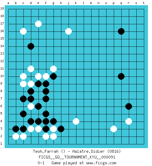 Last move : 0-1 2010 February 4 8:20:2 [Event "FICGS__GO__TOURNAMENT_KYU__000091"] [Site "FICGS"] [Date "2009.10.20"] [Round "1"] [Black "Teoh,Farrah"] [White "Halatre,Didier"] [Result "0-1"] [Rating 2 "0816"] 1.d4 c16 2.q16 r4 3.d10 j16 4.q10 k4 5.d14 e17 6.r6 p3 7.h3 f4 8.f3 g3 9.g4 g2 10.f5 e3 11.e4 f2 12.f4 d3 13.c3 c2 14.b3 b2 15.c5 e8 16.d8 d9 17.e9 c9 18.f8 e7 19.d7 d6 20.c7 e10 21.f9 f10 22.f7 d11 23.e6 c10 24.g10 g11 0-1 This go game has been lost on time (started : 2009.10.20 19:37:27) Here are the names of the openings (joseki) played in the four corners : Corner q4 : r4 r6 Komoku (Somok, Xiao~mu`) 3-4 Point. The komoku (3-4) point is the traditional corner enclosure move.. Player White won this Go (weiqi, baduk) game. Follow this game move after move (download)To invade, need 20 points in open area; otherwise, keshi is best. (Yang Yilun, 7p) Unless I accept my faults I will most certainly doubt my virtues. (Hugh Prather)
