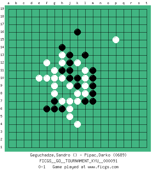 Last move : 0-1 2010 February 7 8:23:55 [Event "FICGS__GO__TOURNAMENT_KYU__000091"] [Site "FICGS"] [Date "2009.10.20"] [Round "1"] [Black "Geguchadze,Sandro"] [White "Pipac,Darko"] [Result "0-1"] [Rating 2 "0689"] 1.k9 p15 2.m11 e10 3.k16 h13 4.j12 k4 5.j13 h12 6.h11 g11 7.g10 h10 8.j11 g9 9.h14 f12 10.h9 f10 11.j10 g10 12.h8 g8 13.g7 h7 14.h6 j7 15.j8 j6 16.g6 j5 17.f6 k8 18.m8 l8 19.l7 l9 20.k10 j9 21.m7 k7 22.m9 l10 23.m10 l11 24.l13 k12 0-1 This go game has been lost on time (started : 2009.10.20 19:37:27) Here are the names of the openings (joseki) played in the four corners : Corner q16 : p15 m11 Go-no-go (Wu~wu~) 5-5 Point. The 5-5 was experimented with briefly during the "New Fuseki" movement in Japan in the 1930s. The 5-5 point has not retained popularity because the 4-4 hoshi (star) point strikes a better balance between influence and territory. As one can see from the variations, though, the 5-5 is playable. Corner d16 : h13 j12 This joseki is unknown. A weak or weird move has probably been played in this corner. Corner d4 : g9 h9 This joseki is unknown. A weak or weird move has probably been played in this corner. Corner q4 : m8 l8 This joseki is unknown. A weak or weird move has probably been played in this corner. Player White won this Go (weiqi, baduk) game. Follow this game move after move (download)Everything happens on a grid-engraved board with black and white pieces, but if that's all you see then you don't know Go. (Pierre Audouard) That's absurd. I love it. (Gregory House, House M.D.)