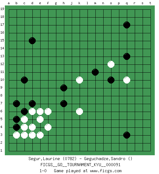 Last move : 1-0 2010 February 10 8:26:5 [Event "FICGS__GO__TOURNAMENT_KYU__000091"] [Site "FICGS"] [Date "2009.10.20"] [Round "1"] [Black "Segur,Laurine"] [White "Geguchadze,Sandro"] [Result "1-0"] [Rating 1 "0782"] 1.d5 f6 2.q3 d6 3.b5 c5 4.c6 c4 5.b7 e5 6.d4 d3 7.e4 f4 8.b4 c3 9.d7 e6 10.c10 b3 11.q17 e3 12.d15 d4 13.q13 k10 14.h9 k6 15.h7 q10 16.o10 o12 17.m11 1-0 This go game has been lost on time (started : 2009.10.20 19:37:27) Here are the names of the openings (joseki) played in the four corners : Corner d4 : d5 f6 Takamoku (Gomok, Gaomu`) 5-4 Point. The takamoku (high) point (5-4). With its emphasis on influence, the 5-4 point complements the 4-4 (hoshi) point in creating an influence-oriented fuseki. Corner q4 : q3 1-0 Komoku (Somok, Xiao~mu`) 3-4 Point. The komoku (3-4) point is the traditional corner enclosure move.. Player Black won this Go (weiqi, baduk) game. Follow this game move after move (download)Do not fear furikawari. (Anonymous) Big Chess is a place for big hallucinations. (Thibault de Vassal)