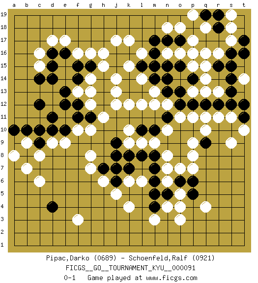 Last move : 0-1 2009 December 6 21:19:58 [Event "FICGS__GO__TOURNAMENT_KYU__000091"] [Site "FICGS"] [Date "2009.10.20"] [Round "1"] [Black "Pipac,Darko"] [White "Schoenfeld,Ralf"] [Result "0-1"] [Rating 1 "0689"] [Rating 2 "0921"] 1.d4 q16 2.j8 k10 3.n9 q4 4.l15 d17 5.c14 c15 6.d15 c16 7.d16 e17 8.e16 f16 9.d14 j17 10.f15 g16 11.g15 h15 12.h14 j14 13.j15 h16 14.k14 j13 15.h13 j12 16.j16 l12 17.k13 k12 18.l13 m13 19.m14 l16 20.k16 k17 21.k15 m15 22.n14 l14 23.n15 n16 24.n13 n12 25.o13 r13 26.o12 o11 27.n11 m12 28.o10 p11 29.p14 p15 30.o15 o16 31.p12 q11 32.q12 q13 33.r12 r11 34.s12 s11 35.t11 t10 36.t12 s9 37.s13 q14 38.s14 p13 39.s15 s17 40.s16 r16 41.t16 t14 42.o17 p17 43.p18 q18 44.r18 s18 45.r19 o18 46.q19 p19 47.t17 s19 48.r15 q15 49.n17 n18 50.m17 d9 51.m16 p16 52.l15 k15 53.m15 c6 54.d10 e9 55.e10 f10 56.f11 g10 57.g11 h11 58.h12 f13 59.c12 e11 60.e12 g12 61.d11 g14 62.e13 k4 63.f14 f3 64.f12 g13 65.c9 c8 66.b8 b9 67.c10 b7 68.b10 a8 69.a10 o3 70.l8 n7 71.m7 n8 72.m8 m9 73.m10 l9 74.l10 k9 75.k8 k6 76.j6 j5 77.k7 h6 78.j7 l6 79.j9 g8 80.h7 g7 81.m6 n6 82.m5 n4 83.m4 m3 84.n5 o5 85.o6 p7 86.p5 o4 87.p6 p8 88.o8 o7 89.o9 p9 90.p10 q10 91.q9 n10 0-1 Here are the names of the openings (joseki) played in the four corners : Corner q4 : n9 q4 This joseki is unknown. A weak or weird move has probably been played in this corner. Corner q16 : q16 l15 Hoshi (Hwajeom, Seongjeom, Xingwei`) 4-4 Point. The star or hoshi (4-4) point, emphasizing influence at the potential expense of territory. Corner d16 : d17 c14 Komoku (Somok, Xiao~mu`) 3-4 Point. The komoku (3-4) point is the traditional corner enclosure move.. Nikken Kakari (Dukan Keolch'im, E`r Gua`jiao~, 2-Space Low Approach). Black 2 is used with friendly forces backing it up. Its purpose is to prevent a pincer. Locally it results in a loss, but may be appropriate fuseki strategy. It was popular in the late 1950s and early 1960s, but is not seen often nowadays, having been replaced by the one-space high approach, with which it has points in common. Player White won this Go (weiqi, baduk) game. Follow this game move after move (download)Win the stones, lose the game. (Anonymous) The bottom line is always the bottom line. (Johann Piek)