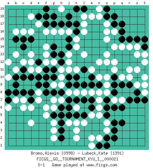 Last move : 0-1 2010 May 8 6:56:9 [Event "FICGS__GO__TOURNAMENT_KYU_I__000021"] [Site "FICGS"] [Date "2009.10.20"] [Round "1"] [Black "Bromo,Alexis"] [White "Lubeck,Kate"] [Result "0-1"] [Rating 1 "0998"] [Rating 2 "1391"] 1.q16 d4 2.q4 d16 3.k10 k4 4.d10 o17 5.p17 o16 6.k16 l17 7.k17 l16 8.f17 e17 9.c15 c16 10.b15 b16 11.d15 o3 12.p3 o4 13.p4 n6 14.o7 n7 15.o6 k8 16.j7 j8 17.h8 h7 18.k7 l8 19.l7 m8 20.m7 o8 21.p8 o9 22.p9 o10 23.p10 p11 24.q11 p12 25.q12 q14 26.q15 p14 27.p13 o13 28.q13 r14 29.r13 o15 30.o11 o12 31.n11 k15 32.j15 k14 33.j14 j13 34.h13 j12 35.h12 j11 36.j10 h11 37.g11 h10 38.g10 h9 39.g8 g6 40.j9 l13 41.n9 n10 42.m10 n8 43.m9 n5 44.o5 f6 45.h6 g7 46.f8 d6 47.d7 c7 48.c8 b7 49.b8 e7 50.d8 e8 51.e9 f16 52.g17 j16 53.j17 h16 54.h17 g16 55.e18 d18 56.f18 g19 57.h19 h18 58.j18 j19 59.g18 h19 60.k19 l18 61.l19 m18 62.o18 n18 63.p18 g9 64.f9 g12 65.g13 f12 66.f11 f13 67.g14 f14 68.o2 n2 69.p2 m2 70.n1 d13 71.h5 g4 72.h4 g3 73.h3 k3 74.g5 f5 75.m6 m5 76.l5 l4 77.k5 j4 78.j5 k6 79.j6 g2 80.h2 k2 81.k9 m11 82.e12 e11 83.f10 d11 84.c11 c12 85.b12 b11 86.c10 b13 87.c14 a12 88.b10 a9 89.b9 a10 90.a8 c6 91.a11 a10 92.a7 a6 93.r15 s14 94.s15 s13 95.s12 p7 96.p6 q7 97.q6 q10 98.q9 r10 99.r9 r11 100.r12 s11 101.s10 t12 102.t14 s9 103.s8 t10 104.r7 t13 105.t15 m1 106.o1 n19 107.o19 p16 108.q17 t8 109.t7 t9 110.s7 pass 111.f19 h19 112.l9 n12 113.l11 k11 114.e10 d12 0-1 Here are the names of the openings (joseki) played in the four corners : Corner q16 : q16 o17 Hoshi (Hwajeom, Seongjeom, Xingwei`) 4-4 Point. The star or hoshi (4-4) point, emphasizing influence at the potential expense of territory. Ikken Kakari (Hankan Keolch'im, Yi Gua`jiao~, 1-Space Low Approach). White 2 is the standard approach move to the 4-4. Corner d16 : d16 f17 Hoshi (Hwajeom, Seongjeom, Xingwei`) 4-4 Point. The star or hoshi (4-4) point, emphasizing influence at the potential expense of territory. Ikken Kakari (Hankan Keolch'im, Yi Gua`jiao~, 1-Space Low Approach). Black 2 is the standard approach move to the 4-4. Corner q4 : q4 o3 Hoshi (Hwajeom, Seongjeom, Xingwei`) 4-4 Point. The star or hoshi (4-4) point, emphasizing influence at the potential expense of territory. Ikken Kakari (Hankan Keolch'im, Yi Gua`jiao~, 1-Space Low Approach). White 2 is the standard approach move to the 4-4. Corner d4 : d4 j7 Hoshi (Hwajeom, Seongjeom, Xingwei`) 4-4 Point. The star or hoshi (4-4) point, emphasizing influence at the potential expense of territory. Player White won this Go (weiqi, baduk) game. Follow this game move after move (download)Don't count territory held by only one eye. (Anonymous) Before all elsed, be armed. (Niccolo Machiavelli)