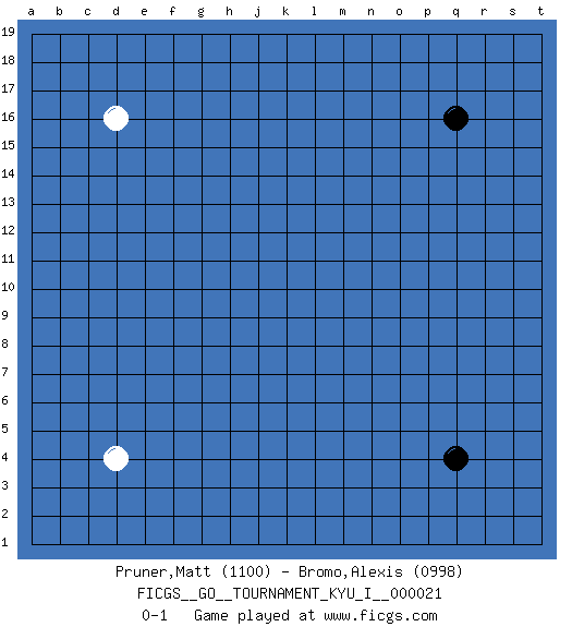 Last move : 0-1 2009 November 23 20:43:23 [Event "FICGS__GO__TOURNAMENT_KYU_I__000021"] [Site "FICGS"] [Date "2009.10.20"] [Round "1"] [Black "Pruner,Matt"] [White "Bromo,Alexis"] [Result "0-1"] [Rating 1 "1100"] [Rating 2 "0998"] 1.q16 d4 2.q4 d16 0-1 This go game has been lost on time (started : 2009.10.20 20:19:52) Here are the names of the openings (joseki) played in the four corners : Corner d4 : d4 0-1 Hoshi (Hwajeom, Seongjeom, Xingwei`) 4-4 Point. The star or hoshi (4-4) point, emphasizing influence at the potential expense of territory. Player White won this Go (weiqi, baduk) game. Follow this game move after move (download)Don't make territory near thickness. (Anonymous) Is not life a hundred times too short to bore ourselves ? (Friedrich Nietzsche)