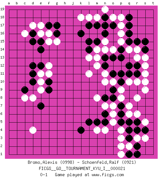 Last move : 0-1 2010 January 24 22:47:28 [Event "FICGS__GO__TOURNAMENT_KYU_I__000021"] [Site "FICGS"] [Date "2009.10.20"] [Round "1"] [Black "Bromo,Alexis"] [White "Schoenfeld,Ralf"] [Result "0-1"] [Rating 1 "0998"] [Rating 2 "0921"] 1.q16 d4 2.q4 d17 3.d10 q10 4.k4 r14 5.r15 q14 6.k16 r6 7.r5 q6 8.d16 e17 9.f17 e16 10.e15 f16 11.g17 g15 12.g16 f15 13.e14 c16 14.d15 c8 15.c9 d8 16.e7 e9 17.f10 e10 18.d11 e11 19.d12 f12 20.e12 f11 21.f9 n17 22.o17 k18 23.l17 l18 24.m17 m18 25.n18 o18 26.n16 n19 27.n17 p18 28.q18 p17 29.q17 p16 30.q15 p15 31.p14 o14 32.p13 n15 33.m15 m14 34.n13 n14 35.l14 m13 36.o13 l13 37.l15 l11 38.s14 r13 39.r12 s13 40.s15 s12 41.q12 s11 42.r11 r10 43.p10 p9 44.o9 o10 45.p11 n11 46.o11 n10 47.q9 p8 48.r9 s9 49.q11 s10 50.q8 q7 51.o8 r8 52.n12 m12 53.p7 o7 54.p6 n7 55.n6 o6 56.p5 o5 57.n5 n4 58.m5 m4 59.l5 p4 60.q5 p3 61.q3 q2 62.r2 p2 63.q1 p1 64.r1 s5 65.s4 r3 66.r4 s3 67.n8 m8 0-1 Here are the names of the openings (joseki) played in the four corners : Corner q16 : q16 r14 Hoshi (Hwajeom, Seongjeom, Xingwei`) 4-4 Point. The star or hoshi (4-4) point, emphasizing influence at the potential expense of territory. Ikken Kakari (Hankan Keolch'im, Yi Gua`jiao~, 1-Space Low Approach). White 2 is the standard approach move to the 4-4. Corner q4 : q4 r6 Hoshi (Hwajeom, Seongjeom, Xingwei`) 4-4 Point. The star or hoshi (4-4) point, emphasizing influence at the potential expense of territory. Ikken Kakari (Hankan Keolch'im, Yi Gua`jiao~, 1-Space Low Approach). White 2 is the standard approach move to the 4-4. Corner d16 : d17 d16 Komoku (Somok, Xiao~mu`) 3-4 Point. The komoku (3-4) point is the traditional corner enclosure move.. Player White won this Go (weiqi, baduk) game. Follow this game move after move (download)The poor player plays the opponent's game for him. (Anonymous) The good fighters of old first put themselves beyond the possibility of defeat, and then waited for an opportunity of defeating the enemy. (Sun Tzu)