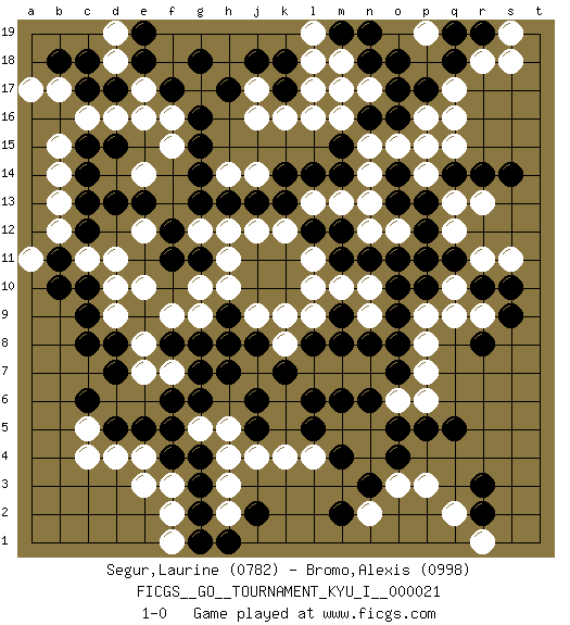 Last move : 1-0 2010 May 23 8:54:15 [Event "FICGS__GO__TOURNAMENT_KYU_I__000021"] [Site "FICGS"] [Date "2009.10.20"] [Round "1"] [Black "Segur,Laurine"] [White "Bromo,Alexis"] [Result "1-0"] [Rating 1 "0782"] [Rating 2 "0998"] 1.d5 q16 2.q5 d16 3.f17 e17 4.h17 k16 5.m15 m16 6.k17 l17 7.k18 l18 8.o16 p16 9.o14 o15 10.p15 n15 11.n16 n14 12.m17 l16 13.m14 n13 14.p17 n17 15.o17 m18 16.n18 m17 17.o18 q17 18.q18 r18 19.r19 s19 20.q19 s18 21.m19 l19 22.n19 p19 23.c9 d10 24.d13 e14 25.g15 f16 26.g16 f15 27.e18 d18 28.g18 j17 29.j18 j16 30.e19 d19 31.r8 q9 32.o13 o12 33.o11 p14 34.p13 q15 35.p12 n12 36.q11 q10 37.q14 p15 38.p10 q13 39.r14 r13 40.s14 q12 41.p11 r11 42.r10 r9 43.s10 s11 44.s9 p9 45.o9 p8 46.o8 p7 47.o7 p6 48.o5 n4 49.o4 o6 50.n6 n7 51.m9 n5 52.m6 m7 53.l6 l7 54.j6 k4 55.k7 k8 56.l8 l9 57.m8 k9 58.k14 j14 59.l12 m13 60.l14 l13 61.k13 k12 62.j13 j12 63.h13 h14 64.g14 h12 65.c10 d11 66.c12 c11 67.b11 d9 68.d8 e8 69.d7 e7 70.g7 h8 71.f8 f9 72.h7 h5 73.j5 j4 74.f5 e4 75.e5 d4 76.g4 h4 77.c15 b14 78.c14 b15 79.c17 c16 80.d17 e16 81.c18 b17 82.b18 a17 83.d15 b13 84.c13 b12 85.e13 e12 86.b10 a11 87.c8 f7 88.g8 g9 89.j8 j9 90.h9 h10 91.m11 l11 92.m12 m10 93.n11 n10 94.o10 n9 95.n8 l10 96.g11 g10 97.f12 g12 98.f11 h11 99.g13 e10 100.h8 c5 101.c6 c4 102.g6 g5 103.f4 f3 104.g3 e3 105.f6 h3 106.g2 f2 107.j2 h2 108.h1 f1 109.g1 o3 110.p5 p3 111.r3 q2 112.r2 r1 113.m4 m5 114.l5 l4 115.n3 n2 116.m2 1-0 Here are the names of the openings (joseki) played in the four corners : Corner d16 : d16 f17 Hoshi (Hwajeom, Seongjeom, Xingwei`) 4-4 Point. The star or hoshi (4-4) point, emphasizing influence at the potential expense of territory. Ikken Kakari (Hankan Keolch'im, Yi Gua`jiao~, 1-Space Low Approach). Black 2 is the standard approach move to the 4-4. Corner q16 : q16 m15 Hoshi (Hwajeom, Seongjeom, Xingwei`) 4-4 Point. The star or hoshi (4-4) point, emphasizing influence at the potential expense of territory. Player Black won this Go (weiqi, baduk) game. Follow this game move after move (download)Don't be greedy ! (Anonymous) The real danger is not that computers will begin to think like men, but that men will begin to think like computers. (Sydney J. Harris)