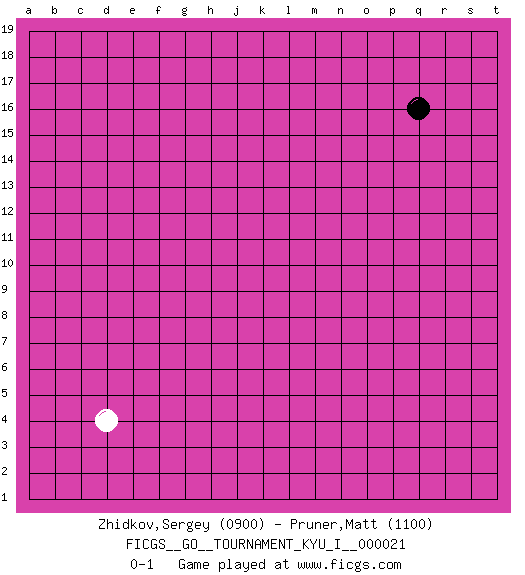 Last move : 0-1 2009 December 16 7:49:36 [Event "FICGS__GO__TOURNAMENT_KYU_I__000021"] [Site "FICGS"] [Date "2009.10.20"] [Round "1"] [Black "Zhidkov,Sergey"] [White "Pruner,Matt"] [Result "0-1"] [Rating 1 "0900"] [Rating 2 "1100"] 1.q16 d4 0-1 This go game has been lost on time (started : 2009.10.20 20:19:52) Here are the names of the openings (joseki) played in the four corners : Corner d4 : d4 0-1 Hoshi (Hwajeom, Seongjeom, Xingwei`) 4-4 Point. The star or hoshi (4-4) point, emphasizing influence at the potential expense of territory. Player White won this Go (weiqi, baduk) game. Follow this game move after move (download)Those who are good at winning, don't usually fight. (Zhang) If only people were all showed a certain minimum level of niceness; if only people didn't retract verbal draw offers (without draw box ticked) on ficgs; if only people didn't kill; if only people didn't run concentration / extermination camps, if only people didn't drop nuclear bombs on Hiroshima and Nagasaki, and so on - it would be a much more beautiful world. But sadly, things are not so... (Normajean Yates)