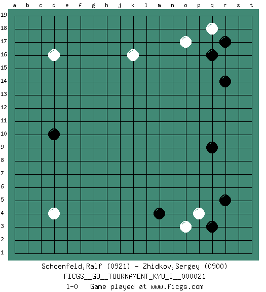 Last move : 1-0 2009 December 7 9:25:10 [Event "FICGS__GO__TOURNAMENT_KYU_I__000021"] [Site "FICGS"] [Date "2009.10.20"] [Round "1"] [Black "Schoenfeld,Ralf"] [White "Zhidkov,Sergey"] [Result "1-0"] [Rating 1 "0921"] [Rating 2 "0900"] 1.q16 d4 2.q3 d16 3.q9 o17 4.r14 q18 5.r17 k16 6.d10 o3 7.m4 p4 8.r5 1-0 This go game has been lost on time (started : 2009.10.20 20:19:52) Here are the names of the openings (joseki) played in the four corners : Corner q16 : q16 o17 Hoshi (Hwajeom, Seongjeom, Xingwei`) 4-4 Point. The star or hoshi (4-4) point, emphasizing influence at the potential expense of territory. Ikken Kakari (Hankan Keolch'im, Yi Gua`jiao~, 1-Space Low Approach). White 2 is the standard approach move to the 4-4. Player Black won this Go (weiqi, baduk) game. Follow this game move after move (download)Don't make dango's. (Anonymous) At work, the authority of a person is inversely proportional to the number of pens that person is carrying. (Dan Rotaru)