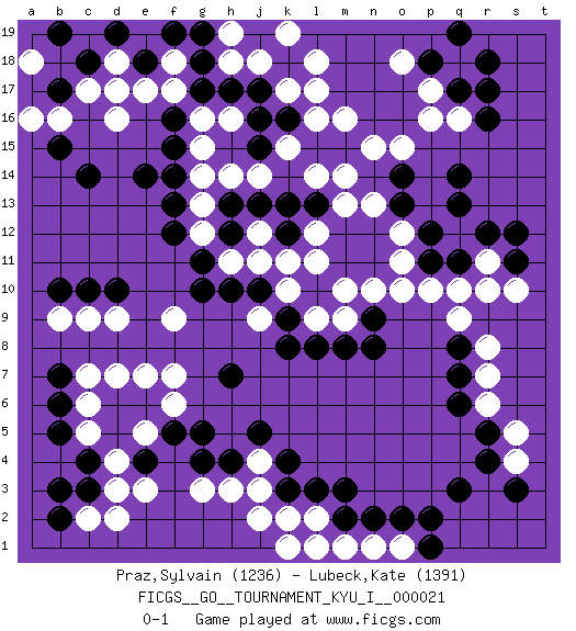 Last move : 0-1 2009 December 30 18:9:22 [Event "FICGS__GO__TOURNAMENT_KYU_I__000021"] [Site "FICGS"] [Date "2009.10.20"] [Round "1"] [Black "Praz,Sylvain"] [White "Lubeck,Kate"] [Result "0-1"] [Rating 1 "1236"] [Rating 2 "1391"] 1.r16 d16 2.q3 d3 3.d5 d7 4.f5 g3 5.c3 c2 6.d10 p16 7.q14 m16 8.c14 f17 9.k4 j3 10.h4 h3 11.r5 q10 12.k3 r7 13.q8 r8 14.q7 q9 15.g4 e3 16.e14 f7 17.h7 n10 18.m8 m9 19.l8 l9 20.k9 k10 21.j10 j9 22.k8 j11 23.h10 h11 24.g10 g14 25.g11 g12 26.h12 j12 27.h13 g13 28.j13 l11 29.k12 k11 30.l13 l12 31.k13 m13 32.l15 m14 33.k16 l16 34.j15 g16 35.h17 h16 36.j16 k17 37.j17 l17 38.g18 j18 39.e18 f18 40.f19 d18 41.n9 m10 42.d19 e17 43.c18 e19 44.k18 l18 45.e18 d17 46.b17 e19 47.j19 k19 48.e18 h19 49.g19 e19 50.m15 n15 51.e18 h18 52.g17 e19 53.f16 g15 54.e18 c17 55.b19 e19 56.f15 c19 57.f12 l14 58.f13 j14 59.f14 k15 60.q17 p17 61.r12 r11 62.c4 c9 63.c10 b9 64.b7 c6 65.b6 c5 66.b5 d4 67.d6 c7 68.b2 d2 69.b3 j4 70.j5 e5 71.e6 f6 72.e4 e7 73.g5 e5 74.b10 d9 75.n8 o10 76.p11 o11 77.p12 o12 78.o13 n13 79.o14 o15 80.s11 s10 81.q11 r10 82.s12 p10 83.q13 r6 84.q6 s5 85.r4 s4 86.s3 k2 87.m3 m1 88.m2 n1 89.l1 l2 90.o2 o1 91.p1 k1 92.p2 q18 93.r18 q16 94.r17 b16 95.d19 a18 96.e18 h14 97.n2 l1 98.l3 j2 99.p18 o18 100.q19 f9 101.b15 a16 0-1 Here are the names of the openings (joseki) played in the four corners : Corner d4 : d3 d5 Komoku (Somok, Xiao~mu`) 3-4 Point. The komoku (3-4) point is the traditional corner enclosure move.. Ikken Takagakari (Hankan Nop'dakeolch'im, Yi Gaogua`jiao~, 1-Space High Approach). The 5-4 approach move has become more popular in modern times, as modern Go emphasizes speed and influence. Corner q16 : r16 p16 Komoku (Somok, Xiao~mu`) 3-4 Point. The komoku (3-4) point is the traditional corner enclosure move.. Ikken Takagakari (Hankan Nop'dakeolch'im, Yi Gaogua`jiao~, 1-Space High Approach). The 5-4 approach move has become more popular in modern times, as modern Go emphasizes speed and influence. Corner d16 : d16 c14 Hoshi (Hwajeom, Seongjeom, Xingwei`) 4-4 Point. The star or hoshi (4-4) point, emphasizing influence at the potential expense of territory. Ikken Kakari (Hankan Keolch'im, Yi Gua`jiao~, 1-Space Low Approach). Black 2 is the standard approach move to the 4-4. Player White won this Go (weiqi, baduk) game. Follow this game move after move (download)The nature of a game comes from what is played, but it's the sensitivity to the possible and the impossible that gives it value. (Pierre Audouard) Gambling : The sure way of getting nothing from something. (Wilson Mizner)