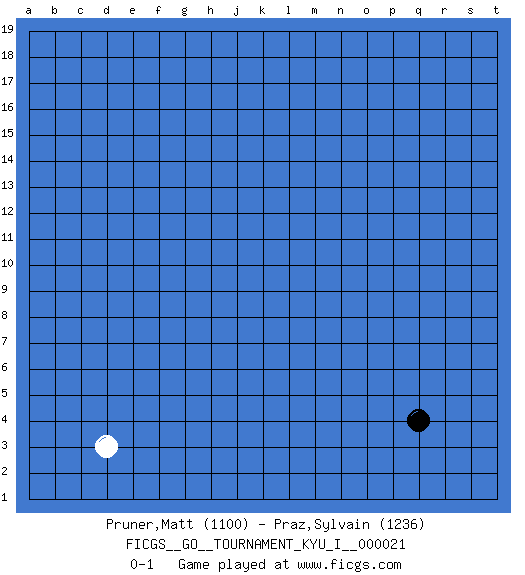 Last move : 0-1 2009 November 21 8:37:16 [Event "FICGS__GO__TOURNAMENT_KYU_I__000021"] [Site "FICGS"] [Date "2009.10.20"] [Round "1"] [Black "Pruner,Matt"] [White "Praz,Sylvain"] [Result "0-1"] [Rating 1 "1100"] [Rating 2 "1236"] 1.q4 d3 0-1 This go game has been lost on time (started : 2009.10.20 20:19:52) Here are the names of the openings (joseki) played in the four corners : Corner d4 : d3 0-1 Komoku (Somok, Xiao~mu`) 3-4 Point. The komoku (3-4) point is the traditional corner enclosure move.. Player White won this Go (weiqi, baduk) game. Follow this game move after move (download)For rectangular six in the corner, dame is necessary. (Anonymous) Crush them ! Make them suffer ! (General Grievous in Star Wars ep.3)
