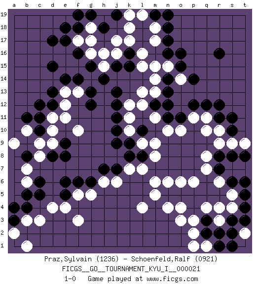 Last move : 1-0 2009 November 30 18:55:32 [Event "FICGS__GO__TOURNAMENT_KYU_I__000021"] [Site "FICGS"] [Date "2009.10.20"] [Round "1"] [Black "Praz,Sylvain"] [White "Schoenfeld,Ralf"] [Result "1-0"] [Rating 1 "1236"] [Rating 2 "0921"] 1.r16 d4 2.d17 r4 3.c6 f3 4.c11 l16 5.n16 g17 6.d15 q10 7.q12 l4 8.g15 h16 9.r7 q7 10.r8 q8 11.s10 r6 12.b4 c3 13.e6 f5 14.f6 g5 15.g6 h6 16.e5 e4 17.h7 j6 18.j7 k7 19.j15 j16 20.k15 l15 21.q3 r3 22.r2 p2 23.q2 o3 24.p4 o4 25.s3 s4 26.t3 q1 27.s1 t2 28.p5 p6 29.o5 n6 30.n5 m6 31.s2 p3 32.q5 q4 33.r5 s5 34.s6 s7 35.t6 t7 36.q6 r9 37.s8 s9 38.r11 t9 39.t8 r10 40.s11 o6 41.k8 l7 42.l8 m8 43.l10 n4 44.n14 l13 45.j13 k12 46.j12 k11 47.j11 k10 48.j10 m14 49.n13 m17 50.n17 l9 51.k9 m9 52.j9 m11 53.o11 o10 54.n11 n10 55.f16 f17 56.e17 e11 57.e9 d10 58.c10 d9 59.e8 c8 60.d8 c9 61.d12 e12 62.d13 e13 63.e14 h15 64.h14 g14 65.g13 f13 66.f14 b6 67.b5 b7 68.c5 b10 69.b11 a9 70.b8 d11 71.c12 f10 72.g12 n15 73.o15 m15 74.o16 m5 75.t5 r6 76.t4 q11 77.p12 p11 78.n18 m18 79.m19 l19 80.n19 k18 81.f18 g18 82.e18 b3 83.g19 h19 84.f19 g16 85.m12 l12 86.a3 a2 87.a4 b1 88.k16 k17 89.h18 j17 90.j19 k19 91.r1 p1 92.r12 o14 93.p14 m13 94.n12 1-0 Here are the names of the openings (joseki) played in the four corners : Corner d4 : d4 c6 Hoshi (Hwajeom, Seongjeom, Xingwei`) 4-4 Point. The star or hoshi (4-4) point, emphasizing influence at the potential expense of territory. Ikken Kakari (Hankan Keolch'im, Yi Gua`jiao~, 1-Space Low Approach). Black 2 is the standard approach move to the 4-4. Corner q16 : r16 l16 Komoku (Somok, Xiao~mu`) 3-4 Point. The komoku (3-4) point is the traditional corner enclosure move.. Player Black won this Go (weiqi, baduk) game. Follow this game move after move (download)Avoid the plate connection. (Anonymous) Players are not good because they find tactics, it is about the way to find the positions in which those tactics are hidden. (Luc-Olivier Leclerc)