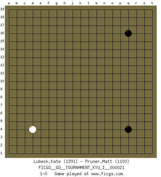 Last move : 1-0 2009 November 21 20:37:42 [Event "FICGS__GO__TOURNAMENT_KYU_I__000021"] [Site "FICGS"] [Date "2009.10.20"] [Round "1"] [Black "Lubeck,Kate"] [White "Pruner,Matt"] [Result "1-0"] [Rating 1 "1391"] [Rating 2 "1100"] 1.q16 d4 2.q4 1-0 This go game has been lost on time (started : 2009.10.20 20:19:52) Here are the names of the openings (joseki) played in the four corners : Corner q4 : q4 1-0 Hoshi (Hwajeom, Seongjeom, Xingwei`) 4-4 Point. The star or hoshi (4-4) point, emphasizing influence at the potential expense of territory. Player Black won this Go (weiqi, baduk) game. Follow this game move after move (download)Don't make compact groups of stones. (Anonymous) For to win one hundred victories in one hundred battles is not the acme of skill. To subdue the enemy without fighting is the acme of skill. (Sun Tzu)