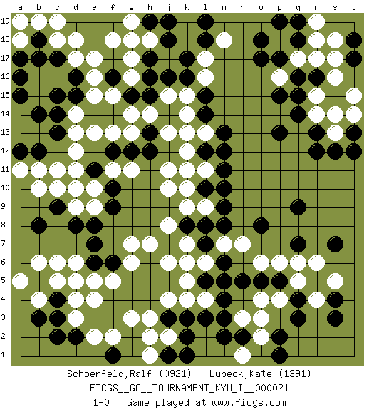 Last move : 1-0 2009 December 17 0:0:59 [Event "FICGS__GO__TOURNAMENT_KYU_I__000021"] [Site "FICGS"] [Date "2009.10.20"] [Round "1"] [Black "Schoenfeld,Ralf"] [White "Lubeck,Kate"] [Result "1-0"] [Rating 1 "0921"] [Rating 2 "1391"] 1.q16 d4 2.q3 d17 3.q9 c11 4.d15 d13 5.f16 o4 6.m4 q5 7.p5 p4 8.q4 p6 9.o5 o6 10.n5 r6 11.q7 q6 12.r12 g3 13.j3 h5 14.k16 j10 15.l10 j8 16.l8 g13 17.s4 s5 18.s7 k6 19.m6 f18 20.h17 c16 21.c15 h18 22.j18 g17 23.h19 g18 24.h16 g16 25.g15 f15 26.f14 e15 27.e14 e16 28.d16 e17 29.c17 b16 30.b17 b15 31.b14 d14 32.c14 g14 33.h15 c18 34.b18 d18 35.c13 d12 36.d8 c6 37.c3 d3 38.c4 c5 39.b5 b6 40.d2 e2 41.c2 b4 42.b3 a5 43.d5 d6 44.e3 e4 45.f3 f2 46.f4 e5 47.g4 h3 48.h4 j4 49.j5 k4 50.g5 g6 51.h6 f5 52.h5 h7 53.l3 r17 54.r16 q17 55.p17 p18 56.o18 p16 57.o17 s16 58.p15 r15 59.q15 r14 60.q18 r18 61.p19 r19 62.b8 b10 63.f6 g7 64.e6 d5 65.e7 g11 66.k3 k5 67.p13 s13 68.s12 k13 69.h13 h14 70.j14 j13 71.h12 j11 72.g12 f13 73.f12 e13 74.e11 e9 75.d10 d9 76.c9 c10 77.f9 e10 78.f10 d11 79.e8 d10 80.b12 f11 81.r13 s14 82.q14 g19 83.j19 j15 84.j16 k15 85.l15 k14 86.m13 j2 87.k2 h2 88.l12 k12 89.l14 k9 90.l7 k7 91.l5 l4 92.m2 l6 93.m5 l9 94.m9 l11 95.m11 k11 96.t13 t15 97.t12 t14 98.q19 l13 99.m12 l16 100.k17 l17 101.l18 m18 102.l19 b19 103.a16 a18 104.a15 a11 105.a12 b11 106.j1 h1 107.k1 c19 108.a17 a19 109.f1 j6 110.t17 s17 111.t18 s18 112.k8 k10 113.m10 m7 114.m8 n7 115.o8 o2 116.p2 o3 117.n2 n3 118.m3 n1 119.p1 r4 120.s3 1-0 Here are the names of the openings (joseki) played in the four corners : Player Black won this Go (weiqi, baduk) game. Follow this game move after move (download)The simplest move is the best move. (Anonymous) I have opinions of my own - strong opinions - but I don't always agree with them. (George Bush)