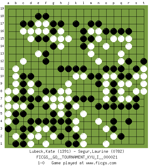 Last move : 1-0 2010 February 11 19:7:52 [Event "FICGS__GO__TOURNAMENT_KYU_I__000021"] [Site "FICGS"] [Date "2009.10.20"] [Round "1"] [Black "Lubeck,Kate"] [White "Segur,Laurine"] [Result "1-0"] [Rating 1 "1391"] [Rating 2 "0782"] 1.q16 d5 2.r4 d15 3.p3 f16 4.q10 r14 5.r12 q13 6.o16 q12 7.q11 p15 8.p16 r15 9.r16 k3 10.p7 q8 11.p8 q7 12.q6 q9 13.p9 r9 14.s7 s10 15.s11 r7 16.r6 s8 17.s6 t9 18.r10 g4 19.k17 m16 20.m17 n15 21.l16 o14 22.m15 n16 23.n17 m14 24.l15 n12 25.l11 q15 26.l14 m13 27.d17 c16 28.c17 c12 29.f18 d9 30.c3 e3 31.c5 c6 32.b5 b6 33.d4 d2 34.c2 a5 35.b4 a4 36.a3 a6 37.d3 e2 38.d6 e5 39.d7 b2 40.b1 d1 41.c1 b8 42.c8 b9 43.e4 f5 44.f4 f3 45.g3 g2 46.g5 g6 47.h4 f1 48.f6 h5 49.g4 n4 50.n6 o7 51.o6 t10 52.n10 p10 53.p11 o10 54.o11 o9 55.n9 o8 56.p6 t11 57.t12 t8 58.j5 h6 59.j6 f7 60.e7 g7 61.e9 d8 62.b7 a8 63.c7 a7 64.c9 b10 65.c10 b11 66.d10 e17 67.e18 f17 68.g17 e13 69.f12 j7 70.k7 j8 71.f8 j9 72.j11 k10 73.k11 l10 74.m10 k6 75.l7 h8 76.g8 e6 77.f6 h7 78.m7 l5 79.j3 k4 80.j4 j2 81.h2 o3 82.p4 p2 83.q2 o1 84.k2 l2 85.j1 l1 86.k1 h14 87.h11 h16 88.h17 j15 89.g16 g15 90.f15 e16 91.g14 h15 92.e15 d16 93.f13 1-0 Here are the names of the openings (joseki) played in the four corners : Corner q16 : q16 r14 Hoshi (Hwajeom, Seongjeom, Xingwei`) 4-4 Point. The star or hoshi (4-4) point, emphasizing influence at the potential expense of territory. Ikken Kakari (Hankan Keolch'im, Yi Gua`jiao~, 1-Space Low Approach). White 2 is the standard approach move to the 4-4. Player Black won this Go (weiqi, baduk) game. Follow this game move after move (download)Good moves and bad moves are bedfellows. (Anonymous) Children in the dark cause accidents, accidents in the dark cause children. (Unknown)